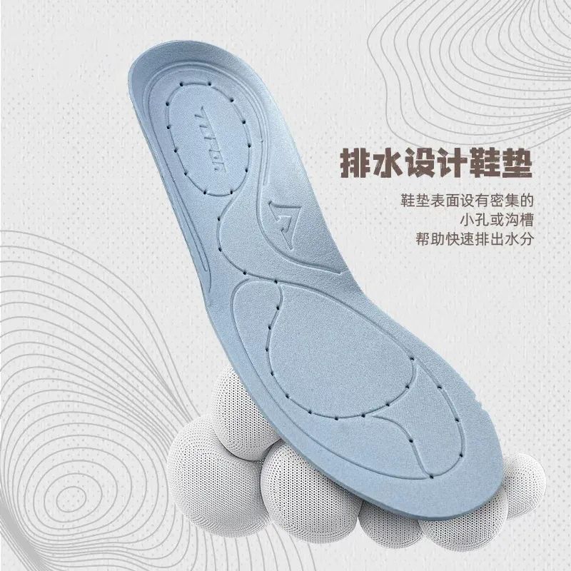 为了加速排水,连 鞋垫上都分布着多个排水孔 ,起脚、抬脚间水流就排出去了。