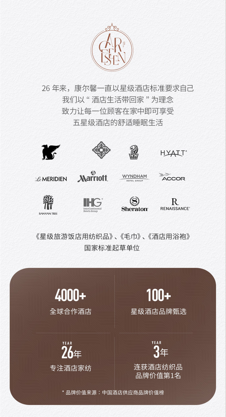 一份好的睡眠至关重要,而五星级酒店在营造“舒适睡眠”方面一直也是其核心体验之一,床品、卫浴品是触手可及的体验~今天给大家带来的是多年来作为多家高端酒店集团的床品、布品合作商的康乃馨纺织集团旗下品牌。帮你把五星酒店的体验用炒鸡优惠的价格搬回家。
