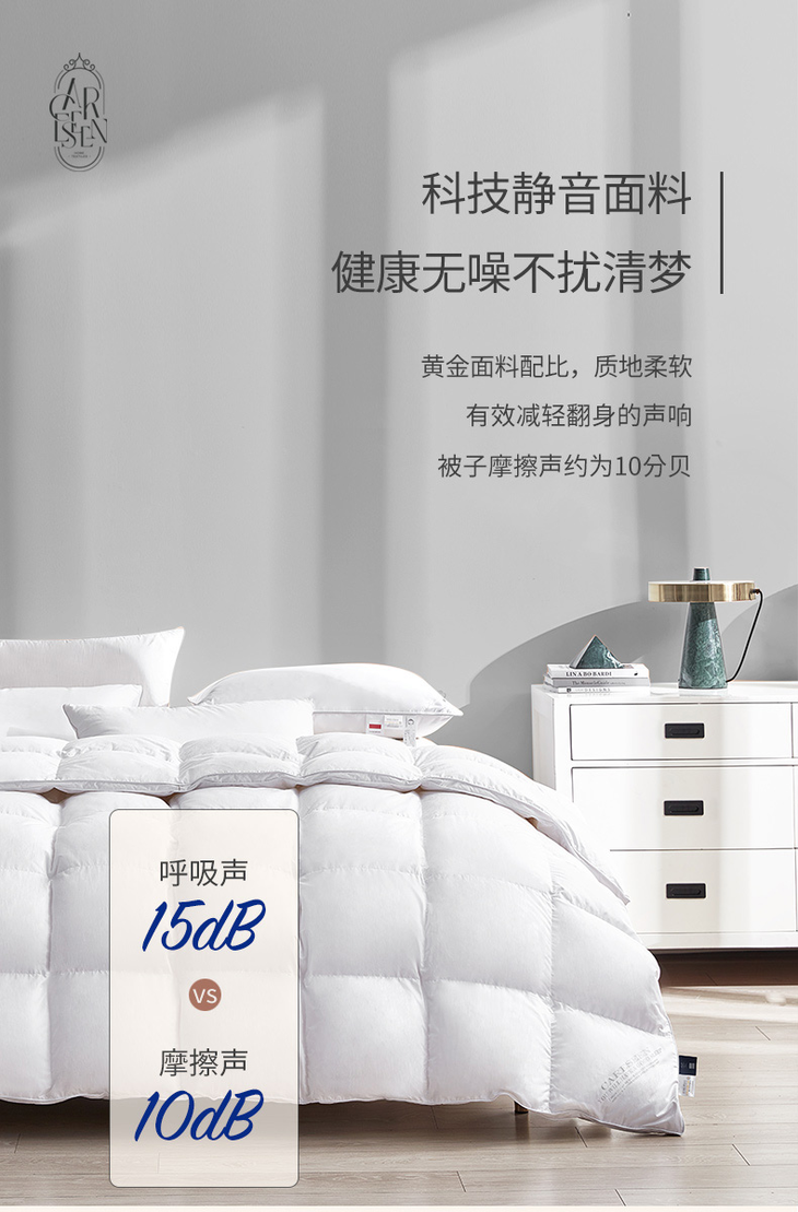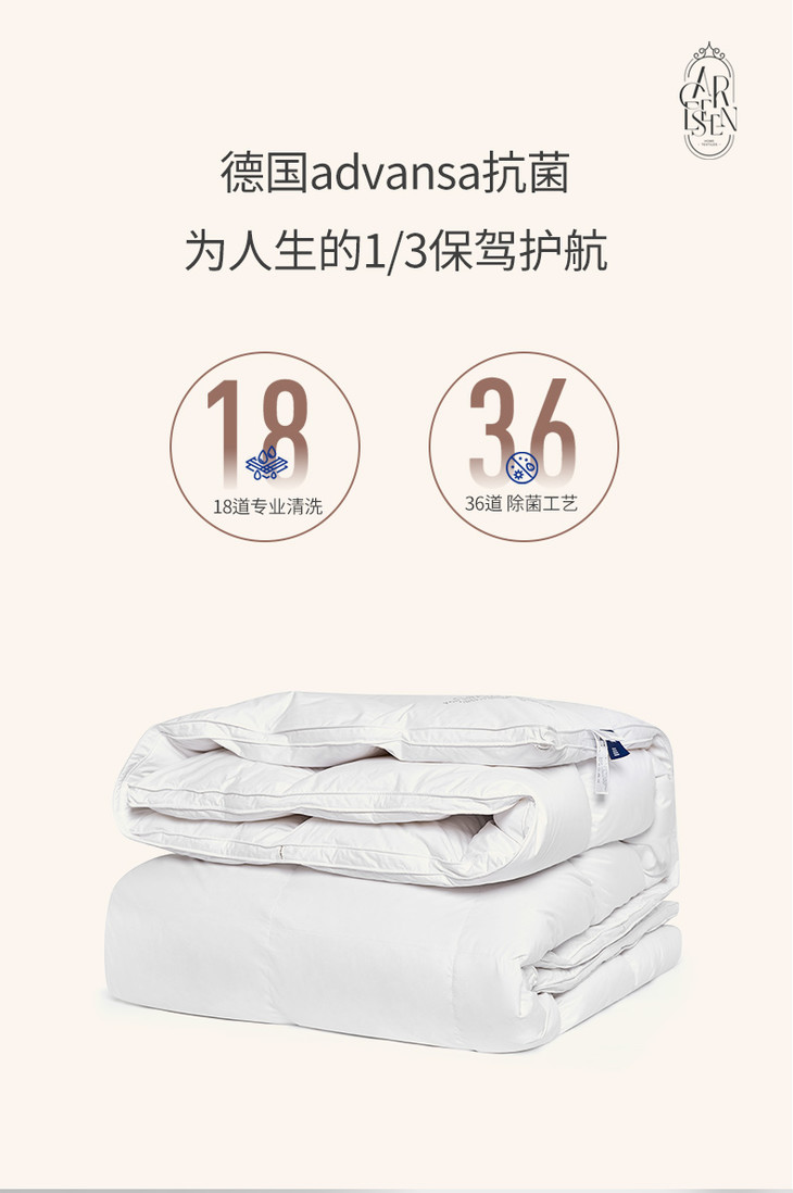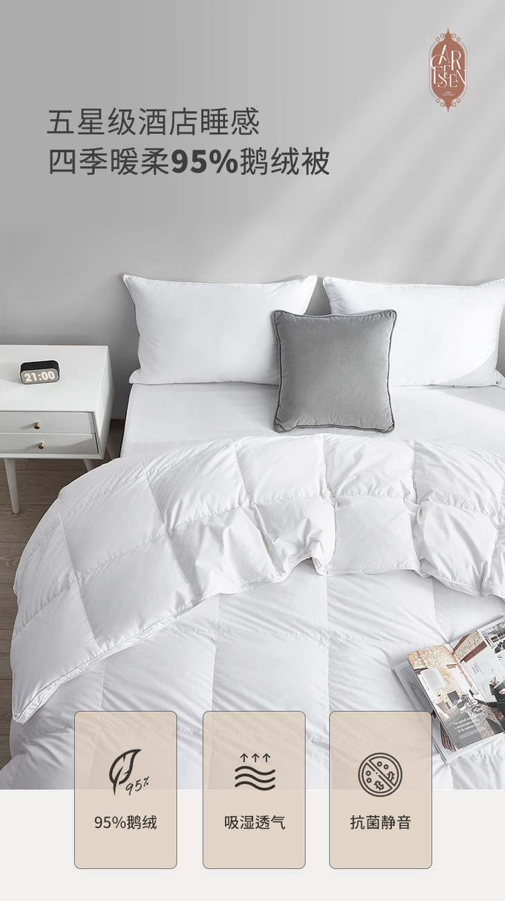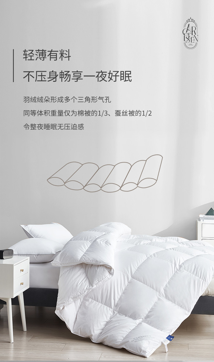采用95%鹅腹部羽绒,绒朵饱满且均匀,杂质少品质高,其蓬松度和保暖性更好,轻盈饱满吸湿透气,抗菌静音,清洁度1000,健康保证放心使用,五星级酒店睡感,带您夜夜“五星级”睡眠!