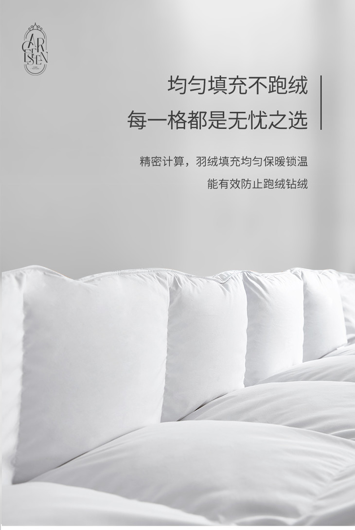 方格衍缝立衬工艺,立框结构设计,在避免睡眠时漏风和冷空气的进入的同时,能有效锁温回暖,透气孔设计,透气排湿孔,持久干爽透气,双边锁扣设计,有效防止跑绒跑芯,航空仓设计,全面呵护睡眠。