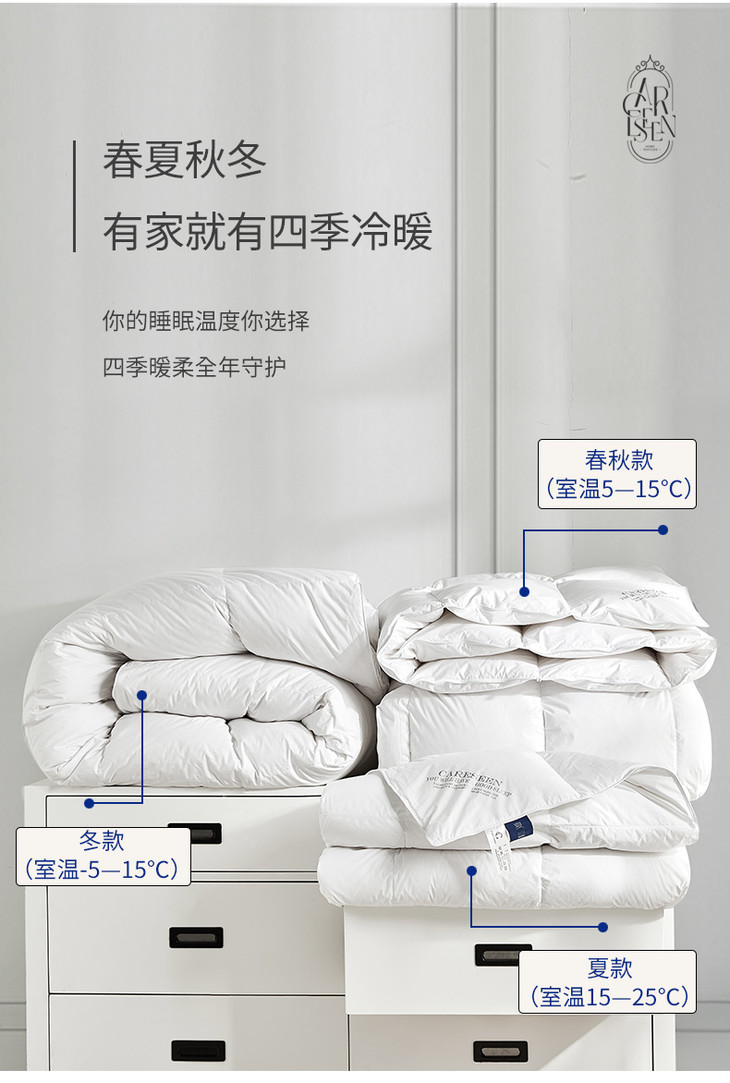 盖上轻巧、有包裹感,可使用春夏秋三季,柔软蓬松的被子盖在身上,还没有负重感,恰到好处的温暖睡眠区,无拘无束、自由舒展,有助于深度睡眠,躺进被窝里又暖又舒服,每天恨不得多睡几个小时!整条被子填充的很均匀饱满,触感更细腻软滑,如同被轻盈空气包裹,周围的包边固定线,加上品牌标志和包装,更显高档大气,自留送礼都是不错的选择~