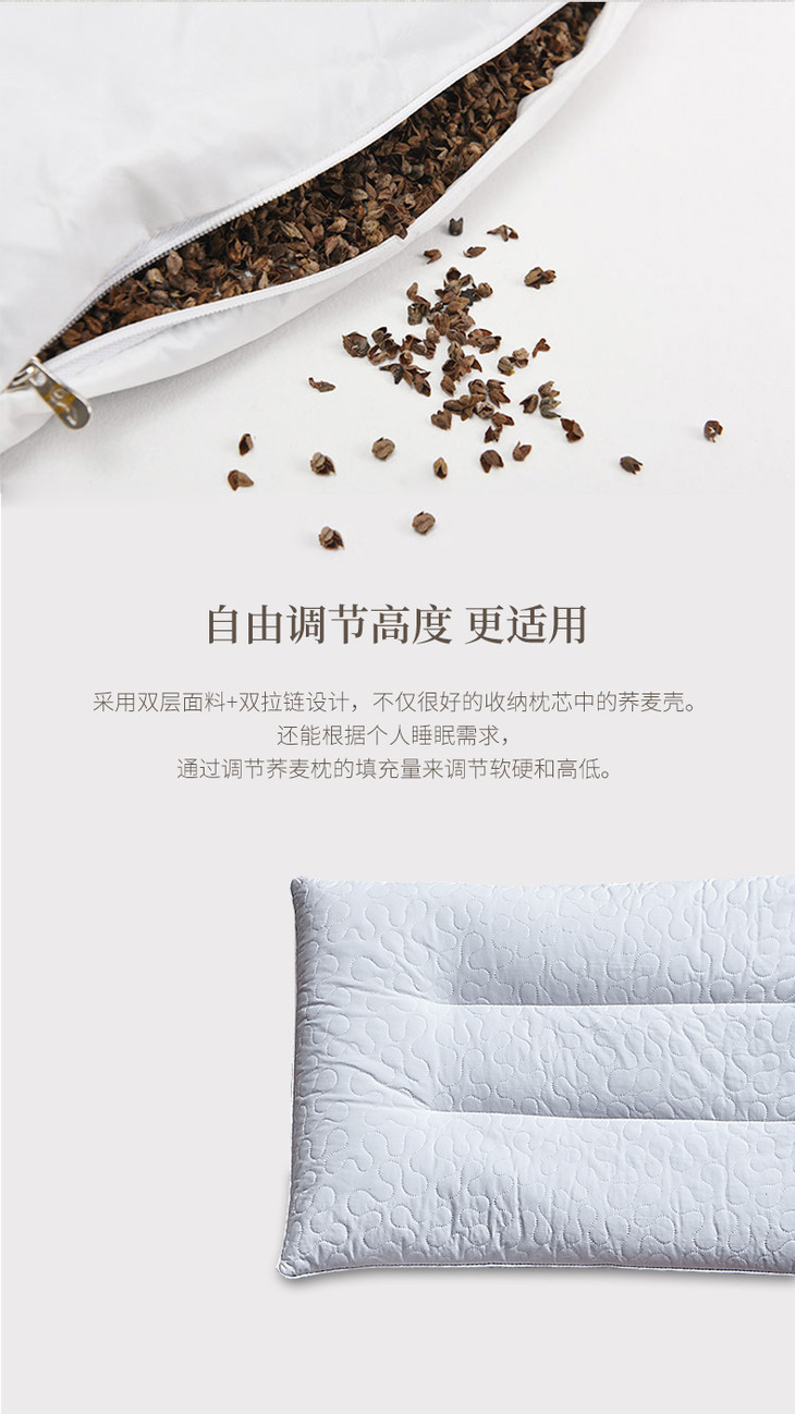 防生锈拉锁设计,方便用久换洗,荞麦枕头具有活血通脉、镇静安神、益智醒脑和调阴阳等作用,其气味淡而不薄,面料细密,触感柔软亲肤,定型护颈设计 ,人体翻身荞麦壳会根据头部流动支撑,荞麦壳的颗粒较大,松松散散的 ,感觉像是在给头皮做按摩,很是舒服。