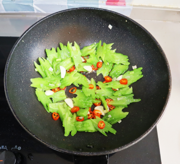 5.线椒切丁,葱蒜切块,少许底油,辣椒葱蒜炸香,放入苦瓜片翻炒,加盐调味
