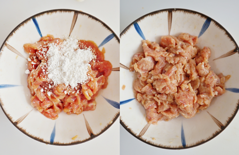 2.牛肉再加一勺红薯淀粉抓拌均匀,放一勺食用油混合,这样可以锁住肉片中的水分,炒出来的肉嫩