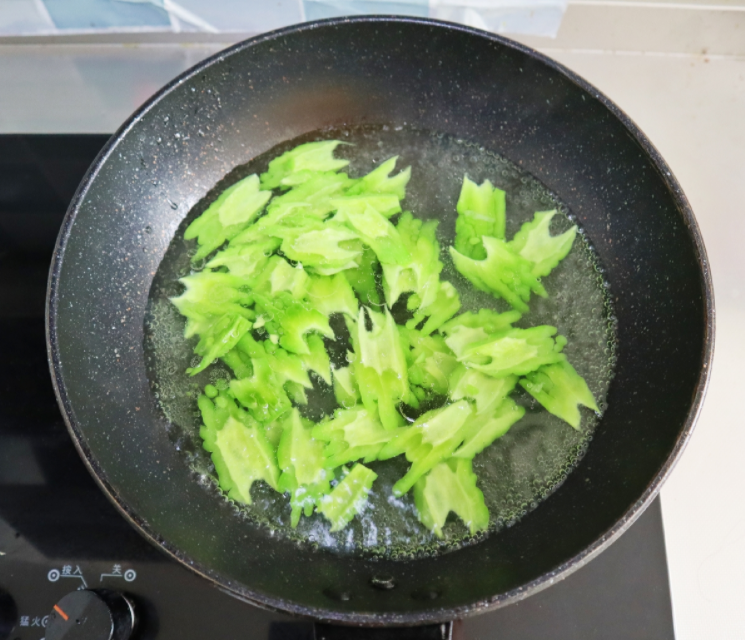 3.苦瓜切开去瓤,斜着切成片状,焯水20秒