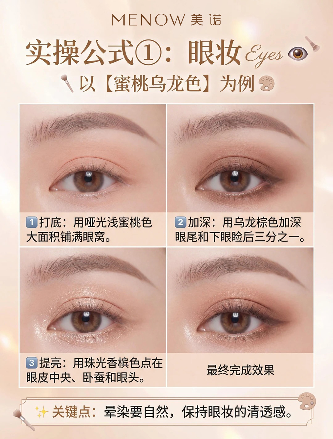 用最浅的蜜桃色给整个眼皮打底,然后用深一点的乌龙棕色加深眼尾三角区和下眼睑,最后用一个香槟金珠光提亮眼皮中央和卧蚕。清透又有神!
