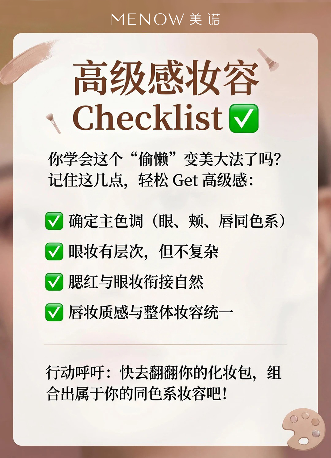 简单说,就是眼妆、腮红、唇妆都选择同一个色系里的颜色。比如整个妆容都围绕着蜜桃色、奶茶色或者豆沙色展开。