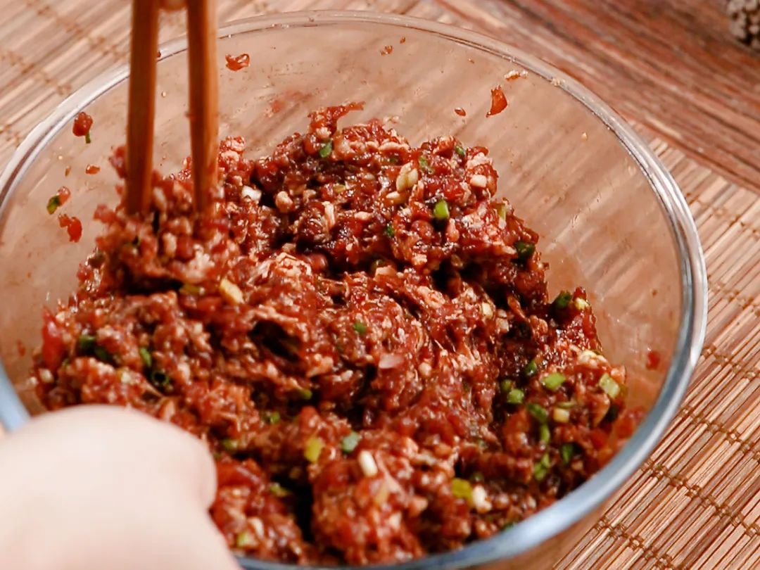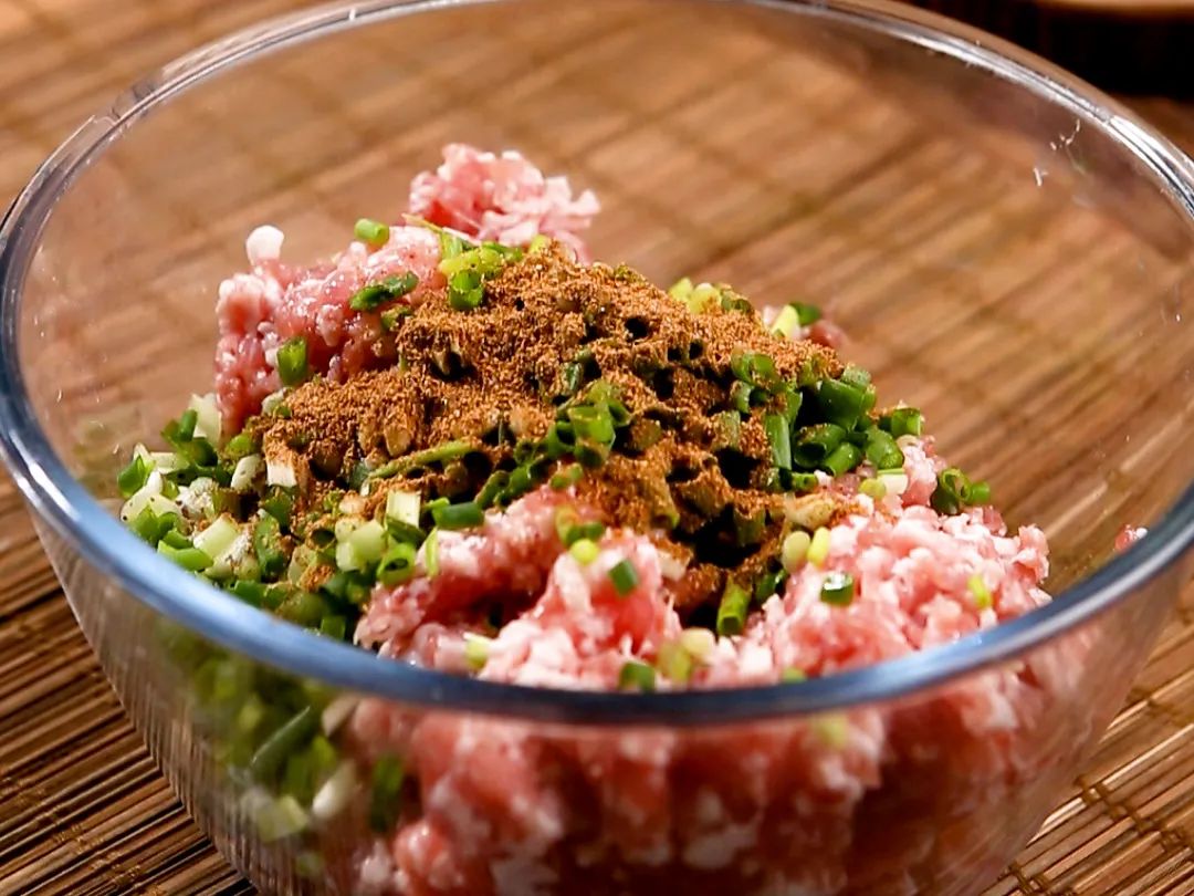 3.调制馅料,五花肉馅中加入生抽,老抽,调味料,小葱,生姜,食用盐等,搅拌均匀,想减脂的宝宝把五花肉换成鸡胸肉哦