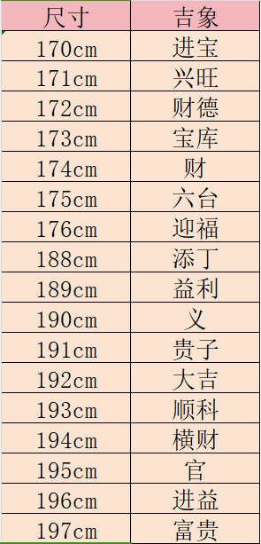 例如:一对夫妇,丈夫右手长度是75 cm,妻子是70 cm,代入公式是(75 cm+70 cm)X 1.3倍=188 cm,再查附表,即可知道188 cm是吉位。
