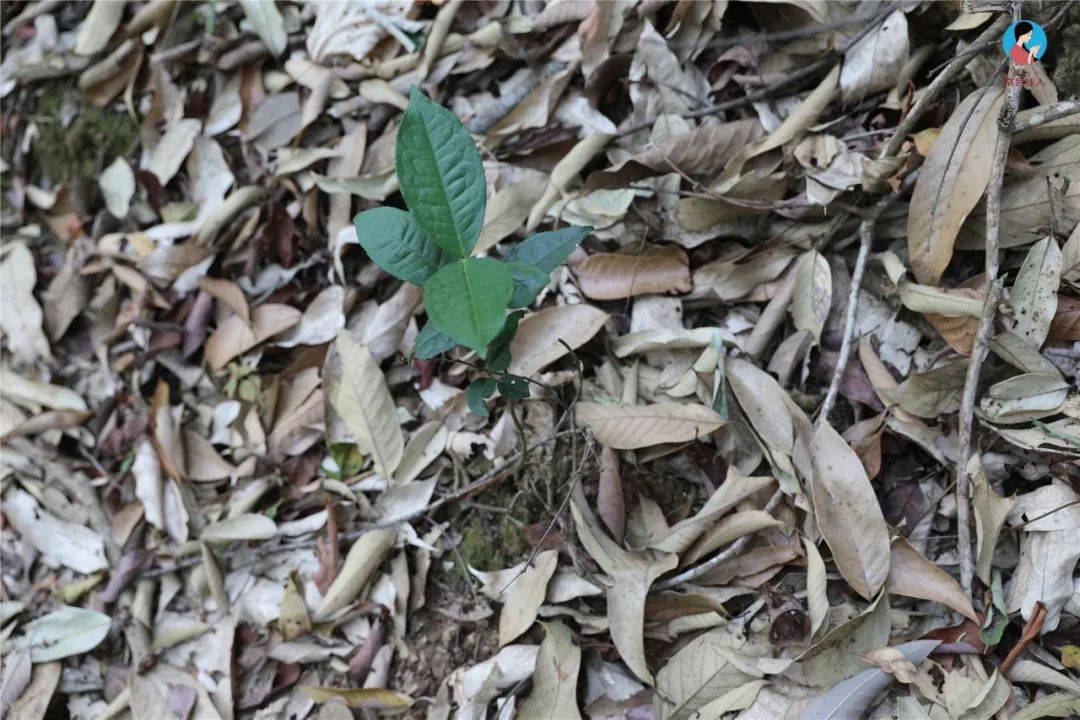 茶树下密集生长着不知名的蕨类植物、灌木等植物,环境十分原始;而古茶树上掉落下的茶籽已经在树下长出新的小茶苗。