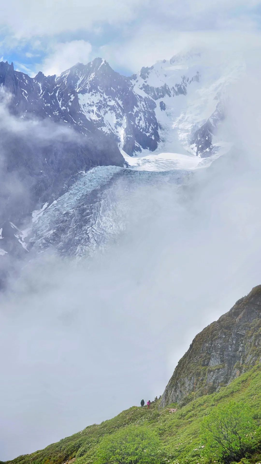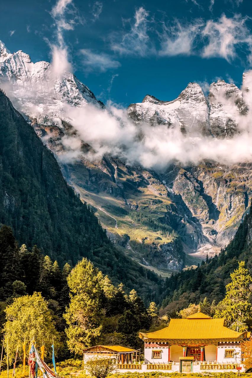 前往冰湖、神湖、神瀑的路上,你可以同时看到原始森林、圣洁雪山、瀑布冰湖。再没有哪条相对轻松又简单的徒步线路能让你看到这么集中的自然风光。圣洁的雪山,宁静的村落,朴实的村民,成群的牛羊,你就会爱上徒步带给你的纯粹。前往雨崩徒步的游客,一般都会选择先到飞来寺住一晚,这里是欣赏梅里雪山日照金山和雪山全貌的绝佳机位,正对面就是雨崩村,但此时的它藏在深山中,你还看不见。走进雨崩,意味着离雪山也越来越近,你眼前会依次出现三座巨大的“雪山冰淇淋”——吉娃仁安峰(五冠峰)、缅茨姆(神女峰)、卡瓦格博。茂密的原始森林只是你初见雨崩的开胃菜,当你走进山谷翻过 3700 米的南争垭口后,眼前豁然开朗。