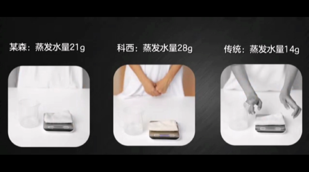 可以看到科西吹风机吹过的毛巾重量蕞低,仅有30g!与初始重量相比,一共蒸发了28g水量。