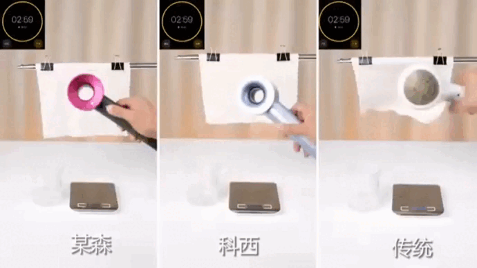 把科西、某森和传统高温吹风机一起打开,开至蕞大风速风温,对着毛巾吹3分钟。