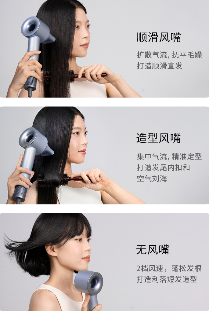 搭配的顺滑风嘴、造型风嘴,不管是顺滑直发,还是内口、刘海都可以轻松吹出~
