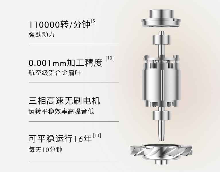 好的吹风机,不光电机要强,加工精度也很重要。 科西吹风机采用0.001mm航空级精密加工,大大延长使用寿命。每天使用10分钟,能平稳运行约16年!