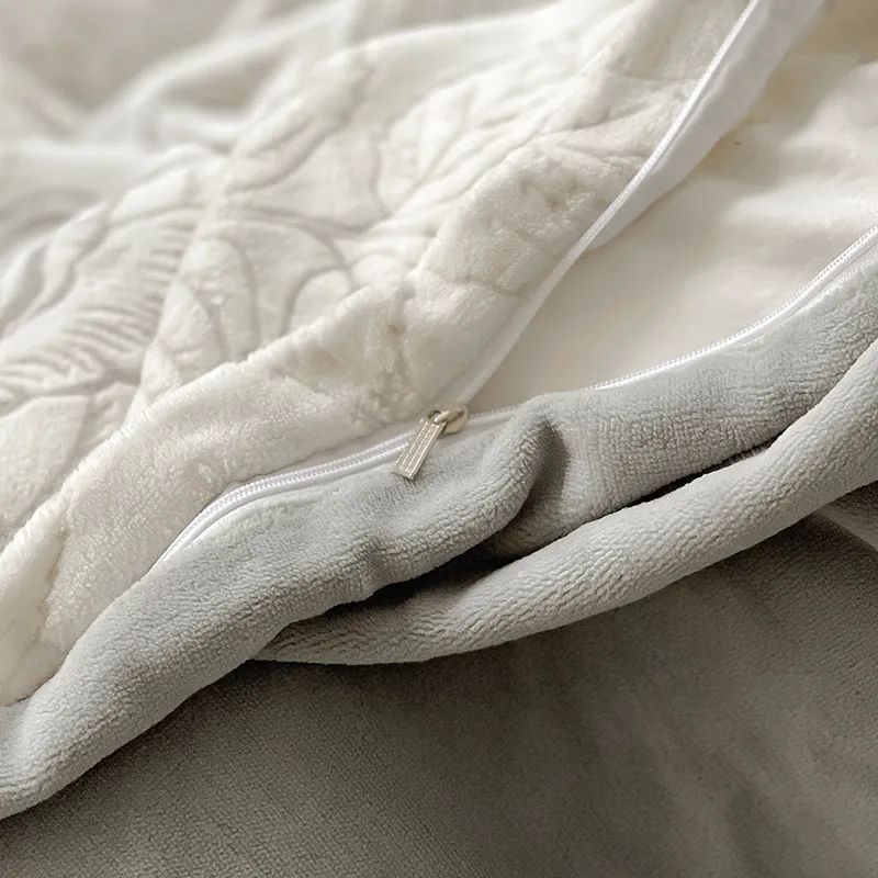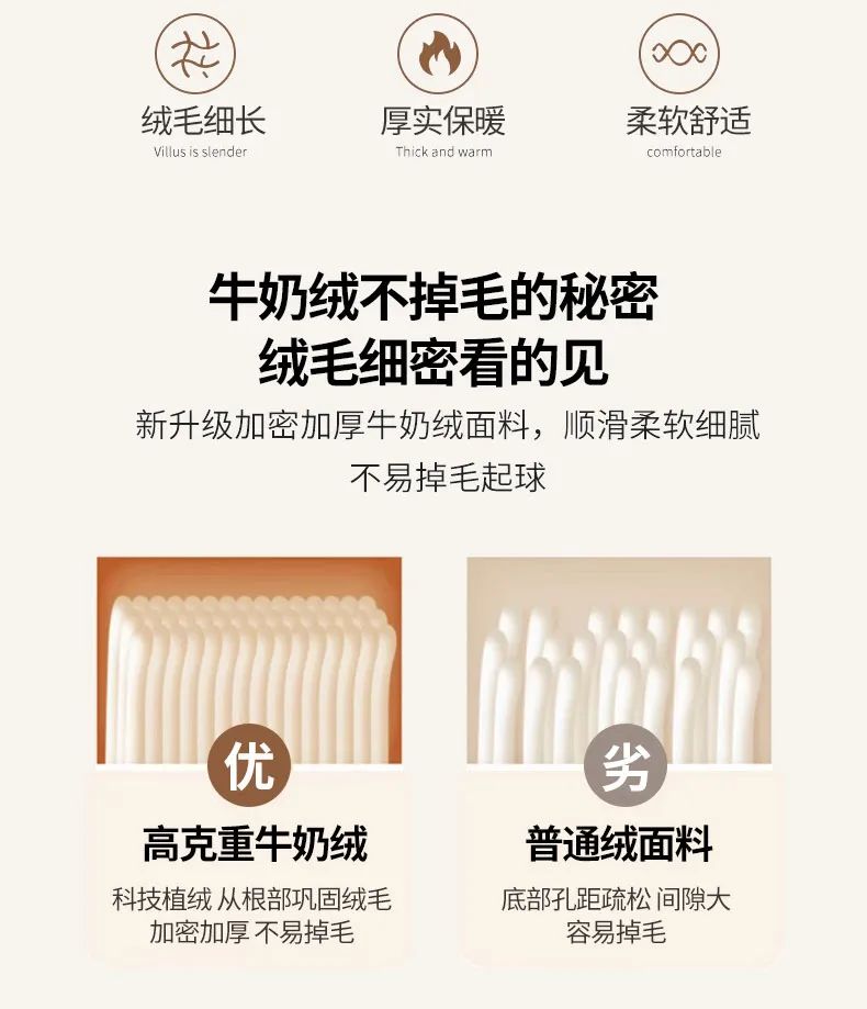 甄选高克重牛奶绒面料,手感细腻,触肤如云般柔软,保暖性好,能将冷空气隔绝在外,让我们躺下就能拥有温暖被窝。更重要的是,牛奶绒具有吸湿、排污、去异味等好处,有助于保持床品的清洁和卫生,减少细菌繁殖的机会!它的柔软性、亲肤性等同或优于羊绒,十分细腻,家里有肌肤柔嫩敏感的小朋友就很适合用它~当然,安全舒适不是靠说的,面料是经过国家专业机构检测过的,A类品质安全认证,适合全家使用,呵护健康安心!经过配比,牛奶绒的保暖性和恒温性确实比市面上的普通绒更高。很多被子冬天刚钻进去冷,还会越睡越冷。而这款摸着是温热的,刚钻下去都是暖的!有了它根本不担心会越睡越冷,就像是“小太阳取暖器”,贼舒爽,早上醒来都不愿意离开的那种!自从睡了后,躺3秒热量从身体到手脚,好像刚洗完热水澡,由内到外的暖起来,一整夜不会半夜冻醒啦~整件被子的做工也很精细,车线工整,拉链也顺滑不卡。来回揉搓也没发现掉毛,睡上个三四年都还很暖和,性价比极致了!近看,每一个小小的短绒毛,就像一个恒温器,时刻帮你抓住温度!
