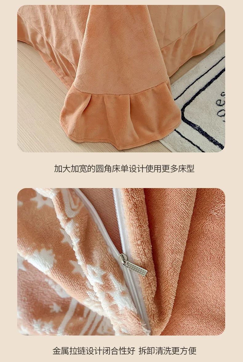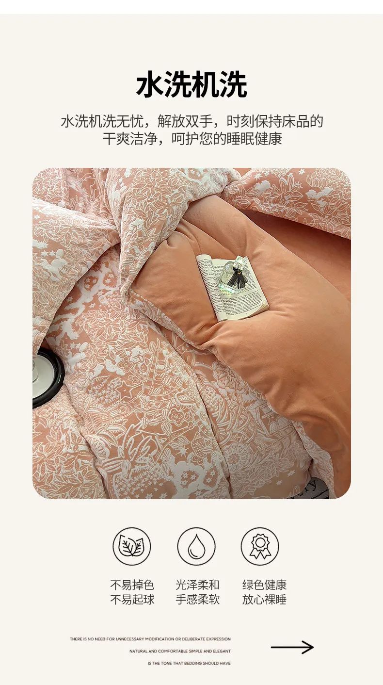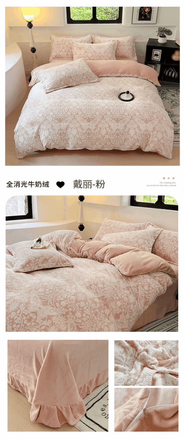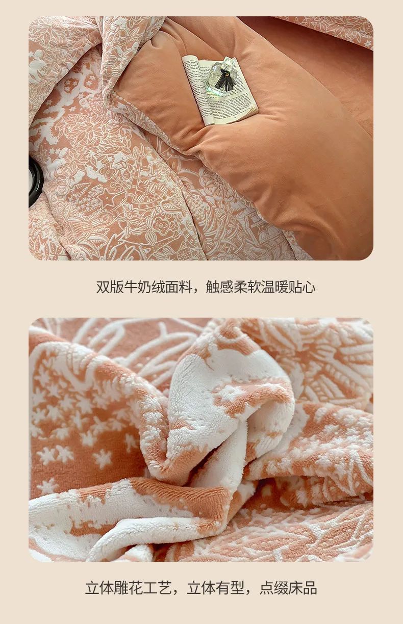 全面包裹保暖:触感如婴儿肌肤,床品再也不是冰冷的存在;温暖覆盖全面:触感服帖,冬天夜晚全身保暖,幸福感嘎嘎提升了~戴丽-粉:柔美的粉色调搭配经典花纹设计,犹如一抹春日暖阳,轻松点亮卧室的温馨氛围。戴丽-蓝:优雅浅蓝调,带来一份静谧与清新,打造舒适自然的睡眠环境。浪花-粉:粉色与浪花的交织,如浪漫海滩的日出般柔情蜜意。浪花-灰:沉稳灰调,低调优雅,营造宁静的睡眠空间。浪花-浅兰:浅蓝浪花设计,清爽与宁静并存,让卧室瞬间拥有海滨度假风情。浪漫花语:细腻花语跃然于面料上,仿佛诉说着温暖与美好的每个夜晚。浪漫玫瑰:经典玫瑰图案,尽显浪漫与优雅,演绎法式卧室的独特格调。浪漫玫瑰-蓝:加入蓝色基调,带来更加沉静的浪漫风情,清新又高级。冷杉-灰:如雾中的森林,低调雅致,质感十足,为卧室增添安然的气息。冷杉-绿:清新的绿意萦绕眼前,让人仿佛置身自然,安享纯净睡眠。流光-粉:如粉色霞光般绚烂柔美,为卧室增添一份梦幻气息。流光-黄:金色流光耀眼非凡,活力四射又温暖怡人,点亮整个空间。流光-蓝:蓝色流光,犹如夜晚的星辰般璀璨,为卧室注入宁静与格调。青艾:复古绿调,低调内敛,演绎自然与经典的完美融合。青艾-浅驼:青艾绿与浅驼的结合,优雅而舒适,极具质感的自然格调。倾慕-蓝:深邃蓝调,简约中透露出一丝浪漫,沉浸感十足。倾慕-浅驼:柔和浅驼色,温暖中带着浪漫气息,贴心守护冬夜的温柔。秋叶:浓郁秋叶配色,像秋日的阳光洒满房间,温馨又惬意。秋叶-绿:清新的秋叶绿,轻盈自然,赋予卧室生命的气息。圣诞鹿-橙:橙色的节日氛围,活泼又温暖,为冬日增添节庆的欢乐感。圣诞鹿-绿:圣诞绿调的点缀,浓厚的冬日仪式感,给卧室增添一丝温馨喜庆。圣诞鹿-米黄:米黄基调搭配圣诞元素,简约又百搭的节日选择。小菊-粉:可爱的粉色小菊图案,甜美又治愈,为卧室增添温柔气息。小菊-绿:清新绿色搭配菊花点缀,满满的自然气息扑面而来。玉馨-橙:温暖的橙色调搭配细腻的花纹设计,为冬日卧室注入活力。玉馨-灰:高级灰色诠释简约与低调的优雅,经典永不过时。圆舞曲:优雅的旋律化作面料上的舞动纹样,浪漫与格调并存,为卧室添上一份别样的情调。价格优惠,能兼具这些优点的市面被子都比它贵!买到真的会觉得赚到的那种~