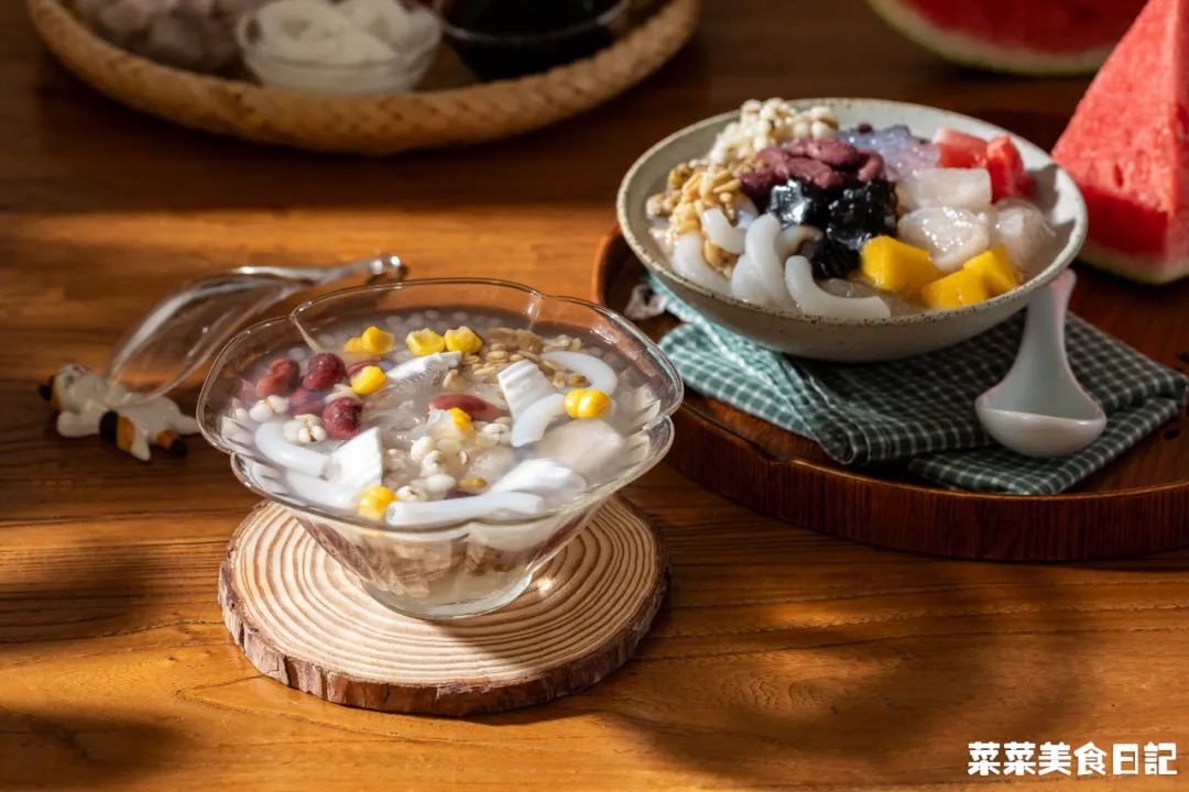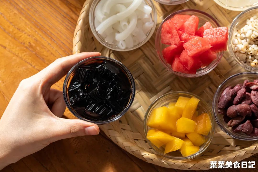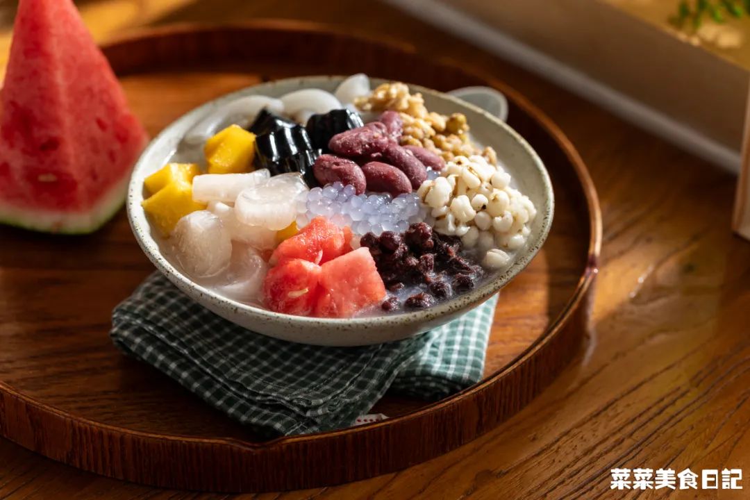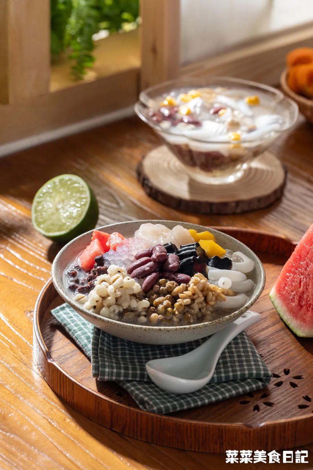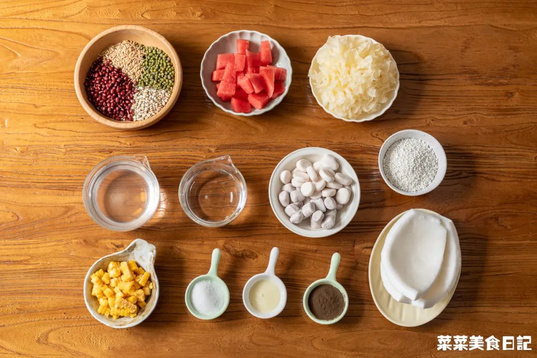 豆类(红豆、绿豆、薏米、燕麦仁)200g 水果玉米100g 西米30g 鲜银耳80g 仙草粉/龟苓膏粉10g 阿达子100g 芋圆100g 水果(西瓜/芒果)100g