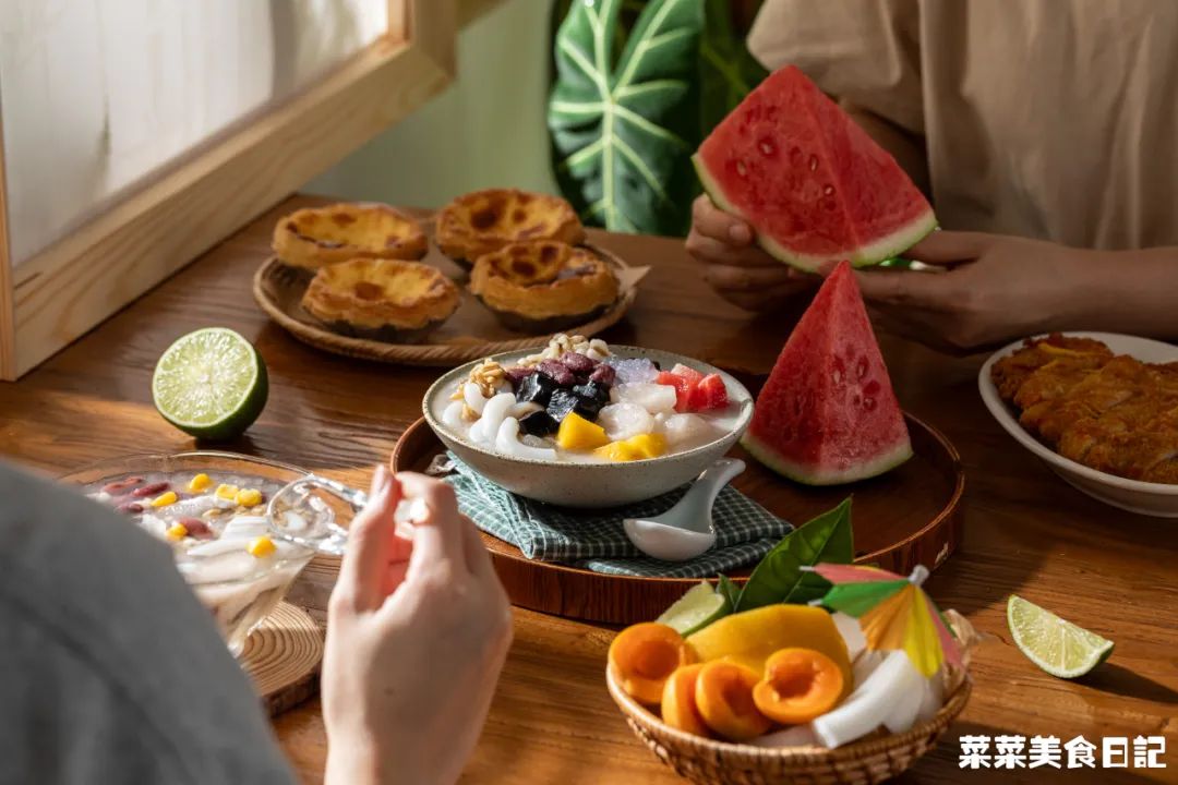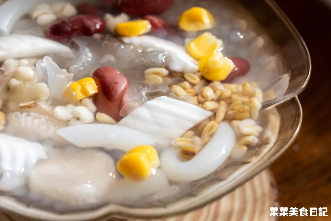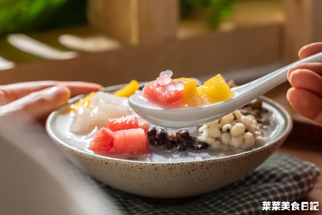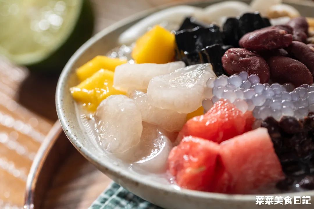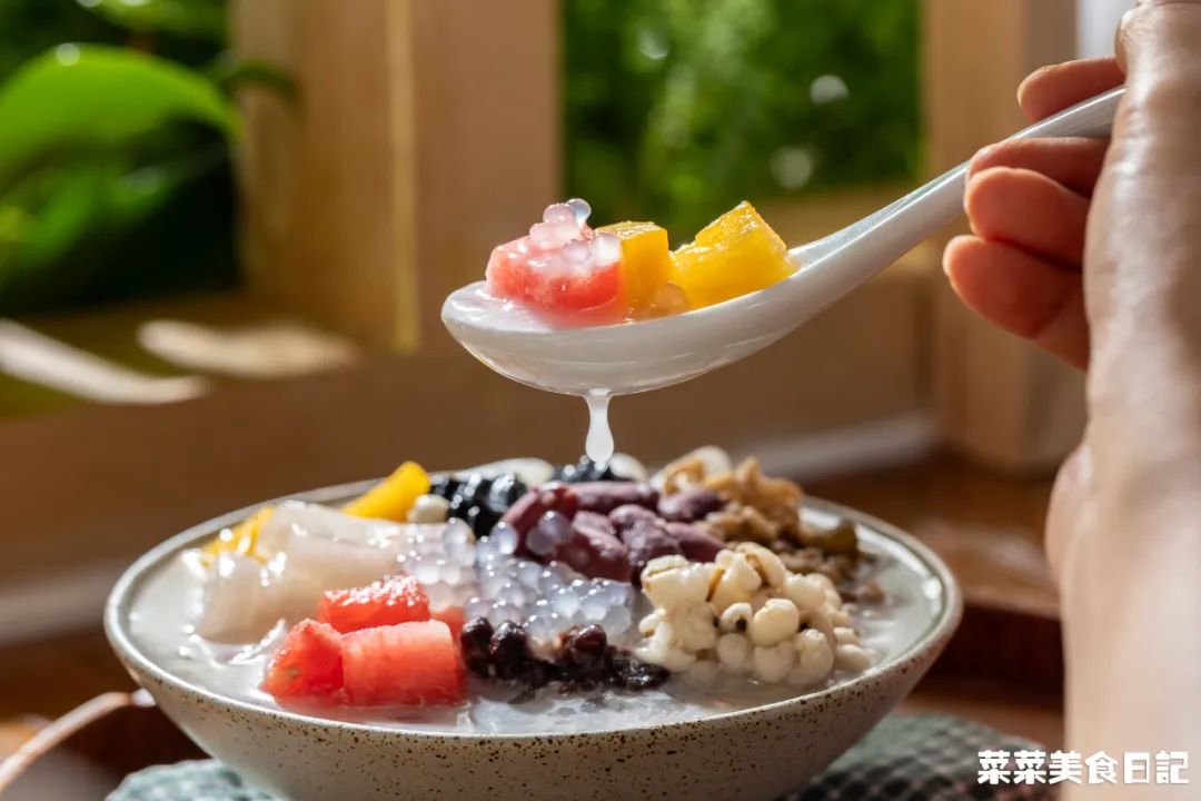 豆类(红豆、绿豆、薏米、燕麦仁)200g 水果玉米100g 西米30g 鲜银耳80g 仙草粉/龟苓膏粉10g 阿达子100g 芋圆100g 水果(西瓜/芒果)100g
