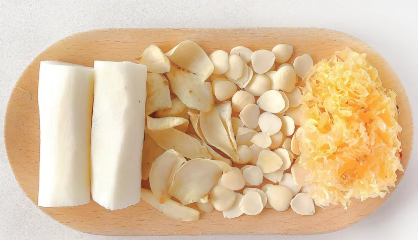 杏仁、百合、银耳、山药,滋润肺部。《黄帝内经》根据五行学说:白主肺,可养气血。