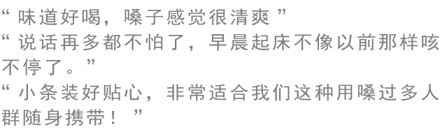 现在我基本每天早上到单位的笫—件事,就是冲上一杯罗汉果玉竹饮,喝下去顿感咽喉肺部清凉舒畅,一整天嗓子都润润的!外出嗓子不舒服的时候,也可以撕开直接喝,方便省事!