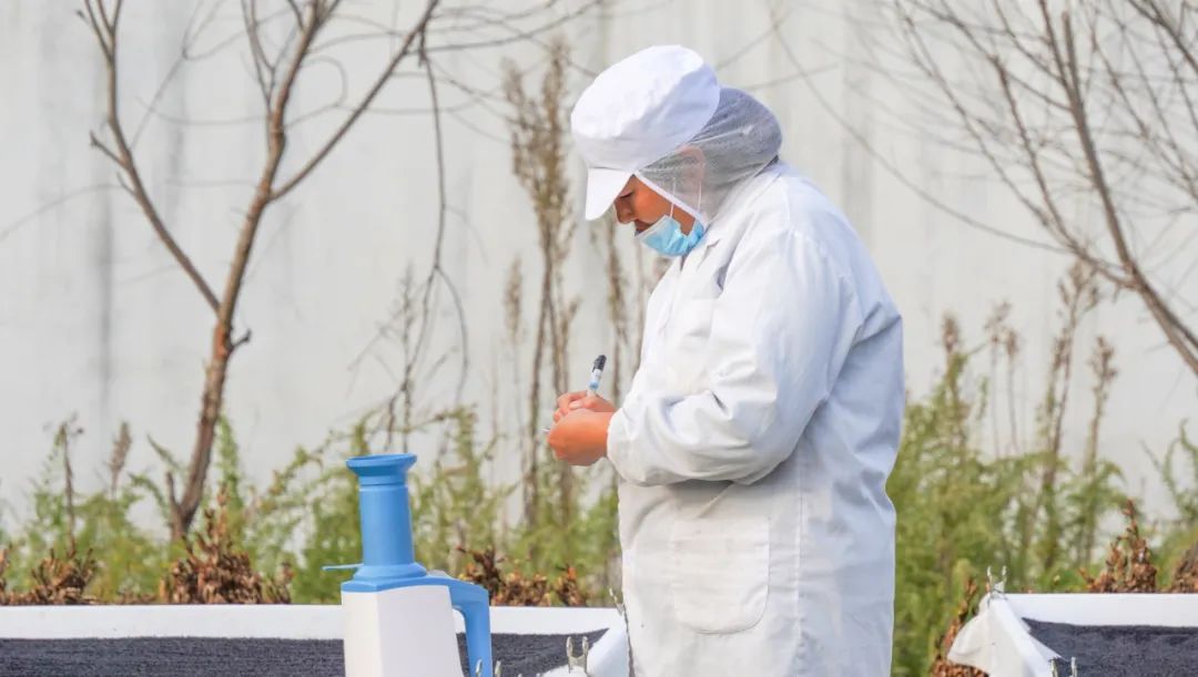 太阳落山前,质检的伙伴拿着水分测定仪到每个晒架取样测定水分并做好记录,大姐们把晒好后的黑芝麻收拢在一起,以备下一次蒸晒,如此反复历经九蒸九晒,质检合格后方可作为半成品入库。