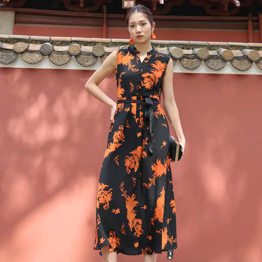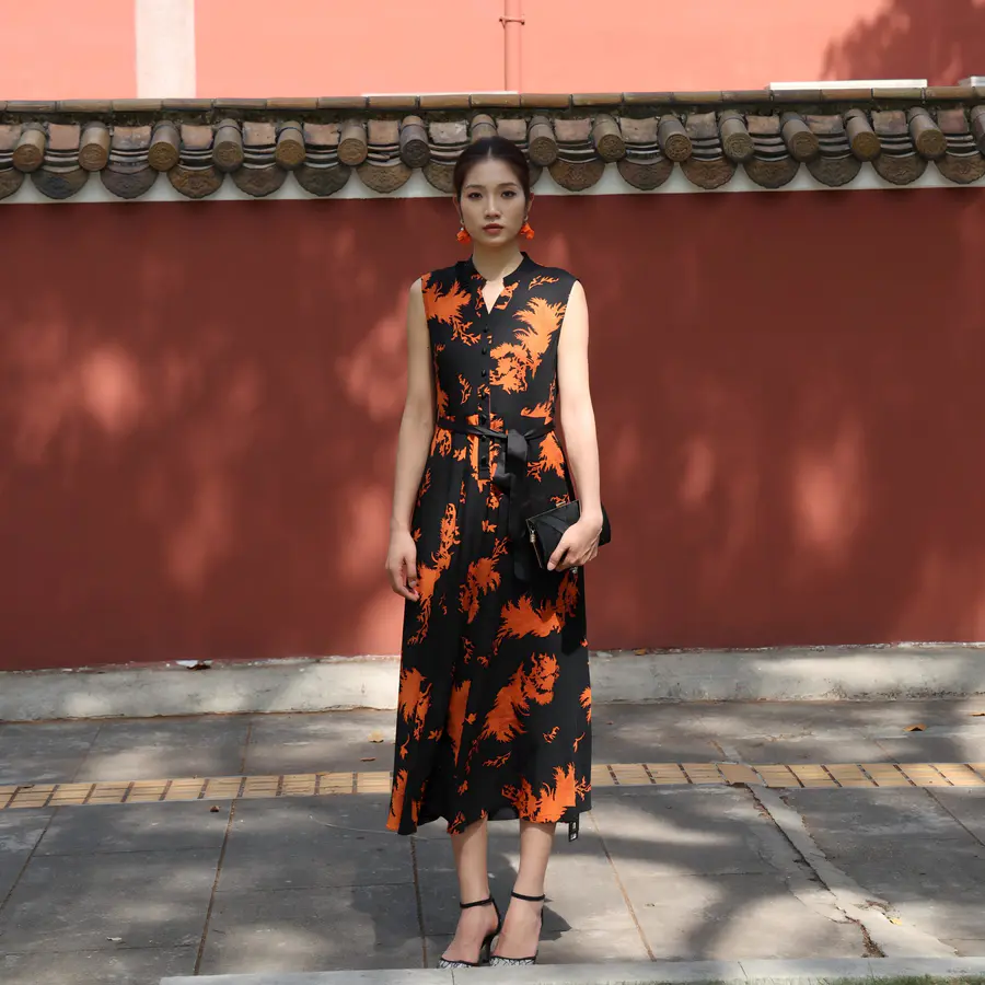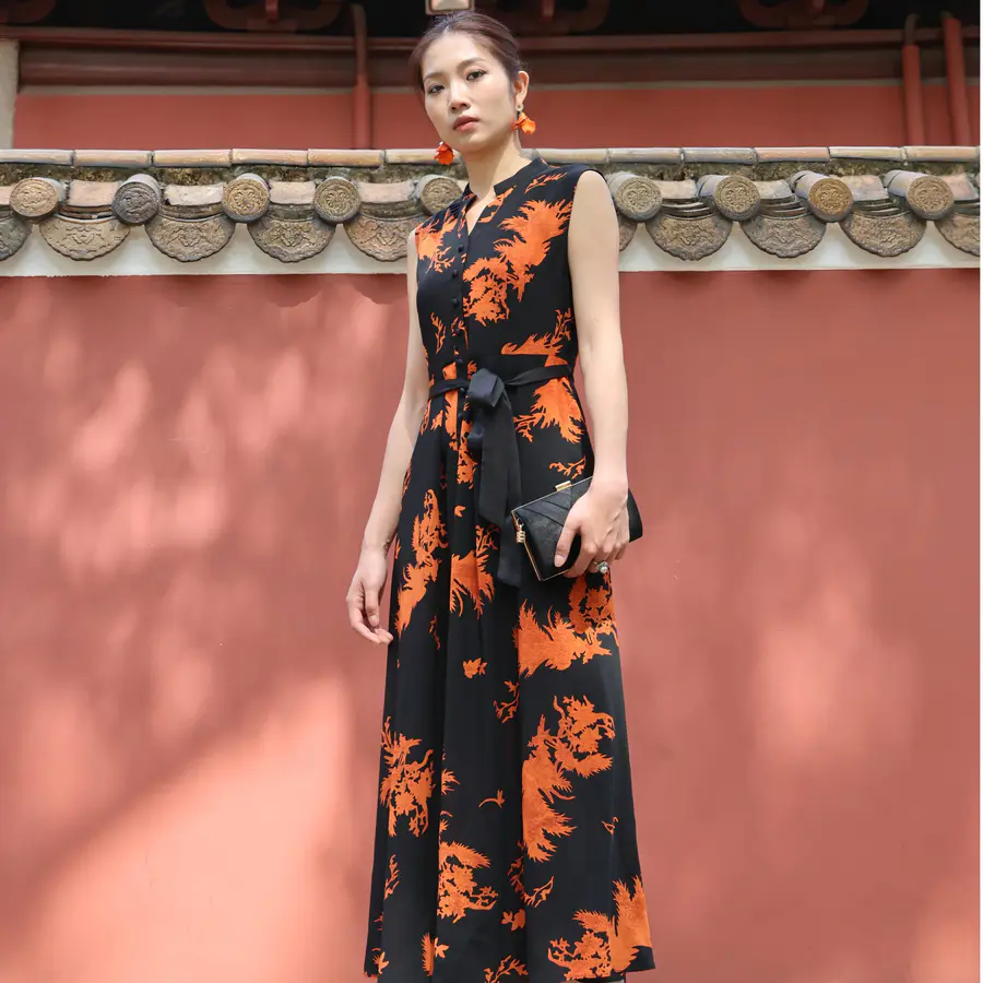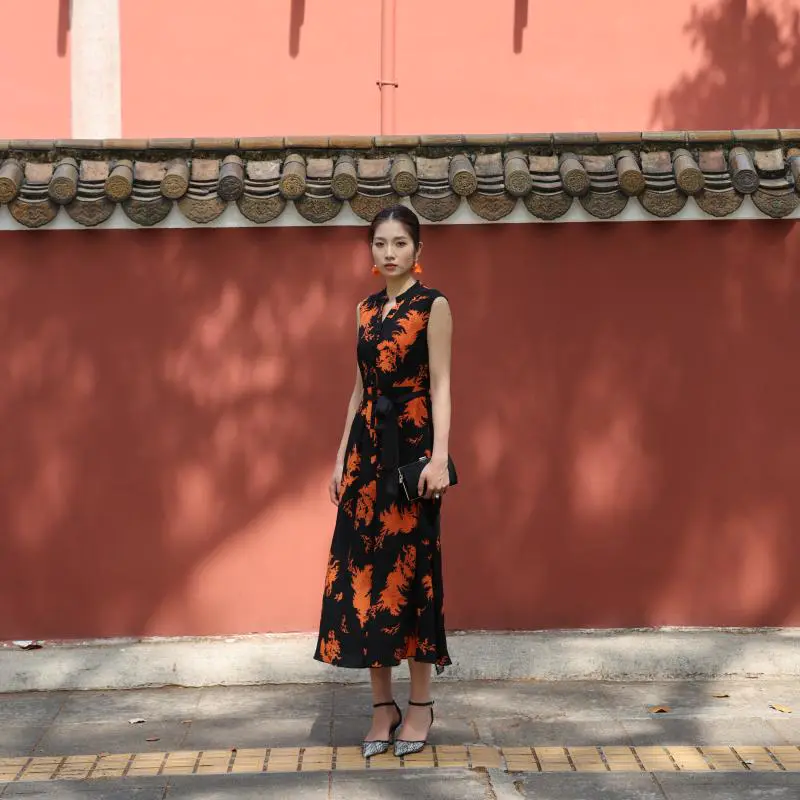 凤凰羽影落进雪纺的经纬 无袖的留白处 是盛夏在颈窝停驻的吻 腰间褶皱藏了三分晚风 A摆扫过宫砖时 整座皇城都成了你衣摆的衬里 要这样漫不经心的美 才配得上七月流火般的相遇
