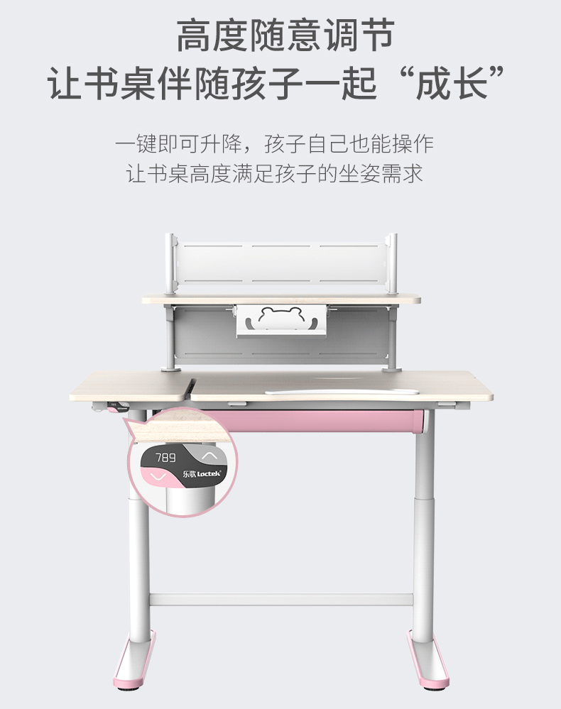 乐歌思学·学习升降桌,采用一键电动升降按钮,让桌子的高度可以适配各个阶段不同身高的孩子,伴随孩子快乐童年,一起成长!