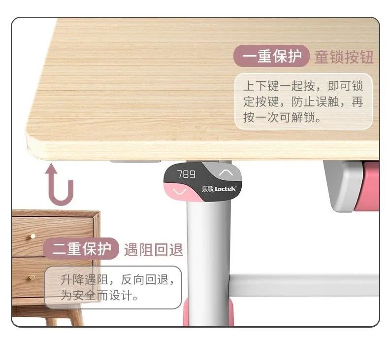 第二重保护:在升降过程中,遇到阻力时,桌子会向反方向退回,更进一步保护孩子和财产的安全。