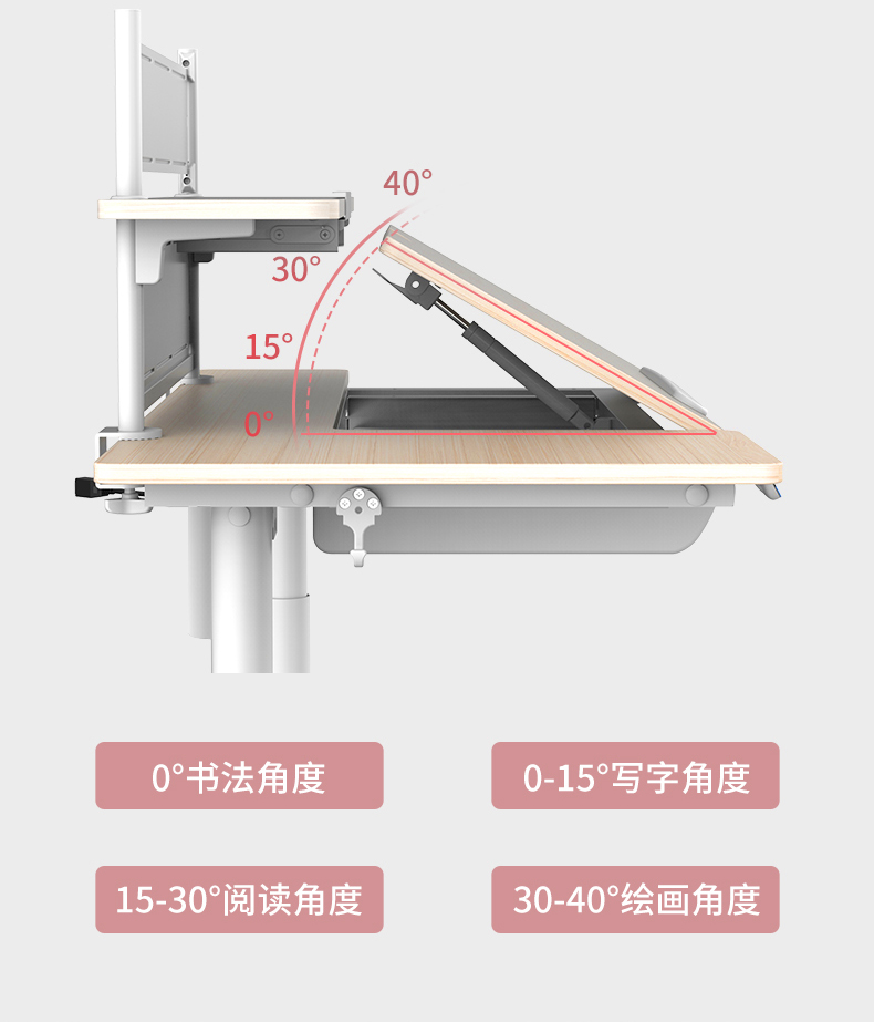 桌面角度的调节采用了气弹簧无极调节,安全又便捷。针对孩子绘画、阅读、书写,都有合适的桌面角度可以选择,既纠正坐姿,又呵护视力。