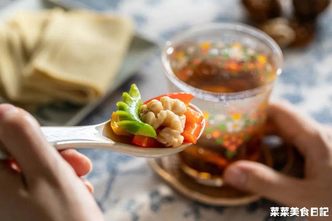 比如我还加了青瓜和木耳,木耳对三高人群也很友好,这菜可以多做给家里老人吃。用坚果搭配脆口时蔬的吃法,在粤菜里也很常见,不过我们一般做小炒。
