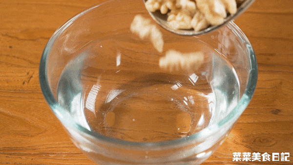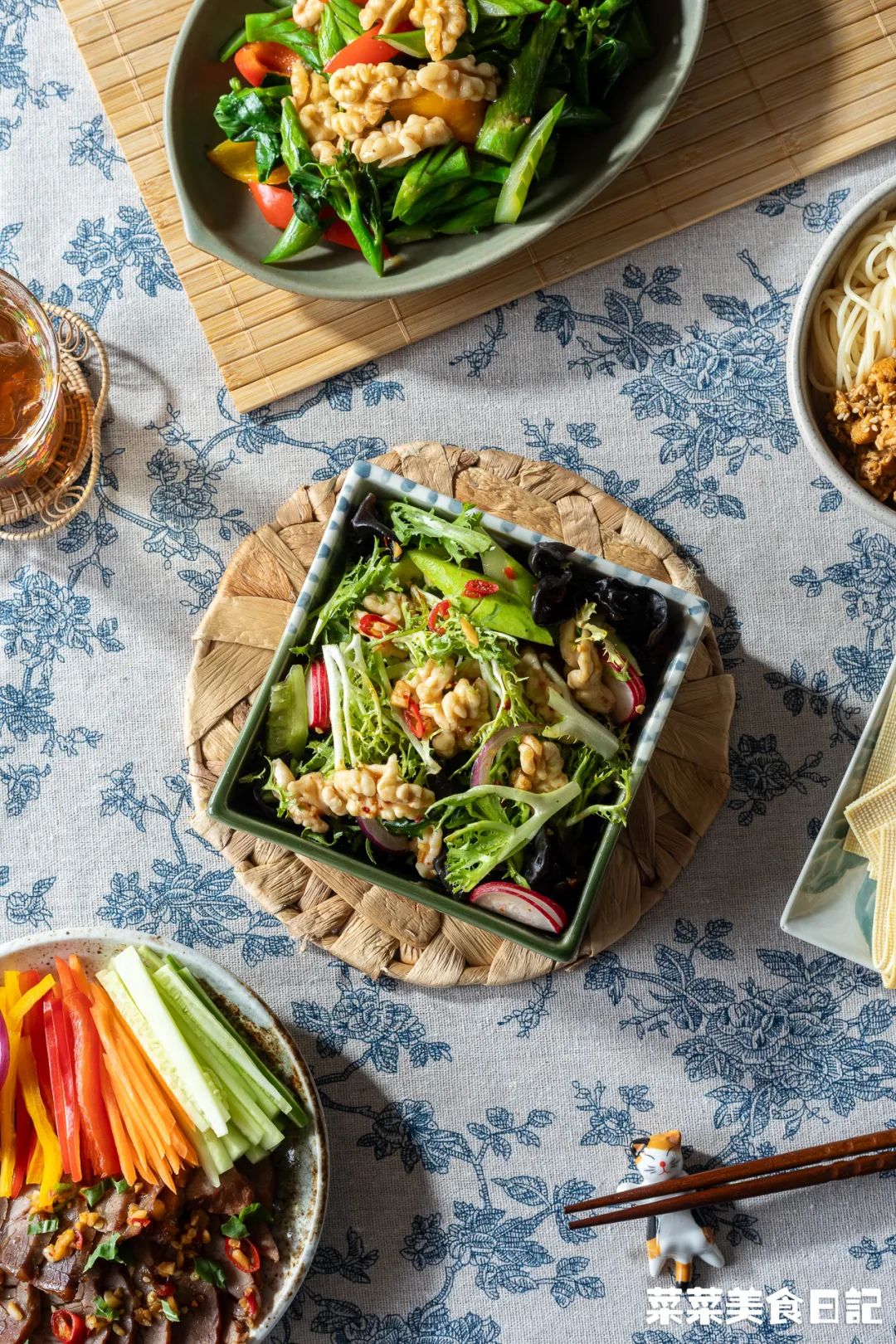 我选了芥蓝来搭核桃,换成西芹、马蹄、韭菜花也行,不加一块肉,照样人人抢。两道菜都没啥难度,但打90分还是满分,差别在于细节的把控。前头说了,鲜核桃仁好吃,就是那层褐色薄皮会发苦发涩,还影响口感。要是怕费手、费眼睛,现在市面上有现成的鲜核桃仁,剥得一干二净,开袋即食。鲜核桃80g 苦菊/芝麻菜100g 青瓜100g 木耳100g 小米辣2个 辣椒面1小勺 蒜末1.5大勺 生抽2大勺 香醋/佛手醋2大勺 香油1大勺 盐1.5小勺 糖1小勺1大勺=1 table spoon=15ml