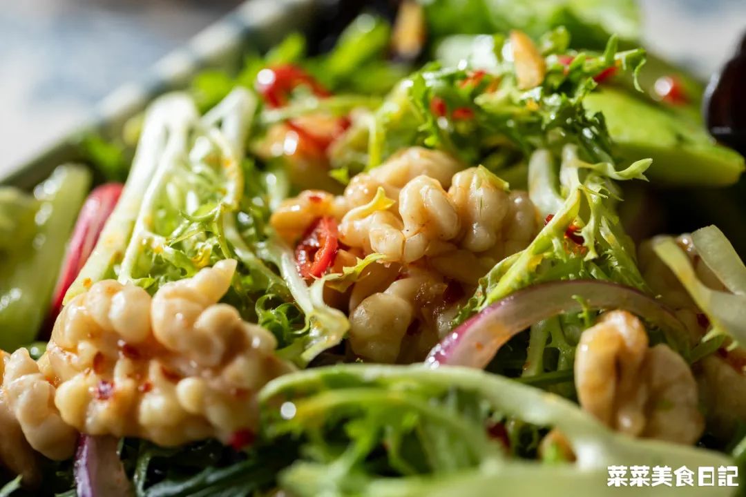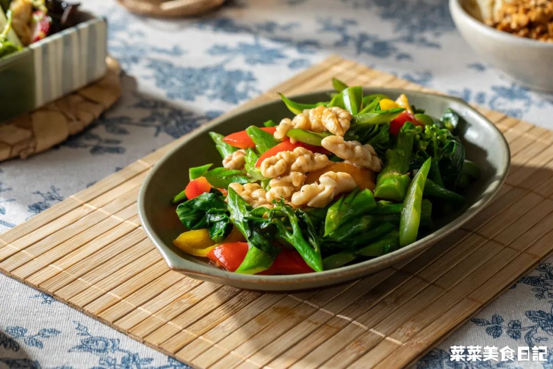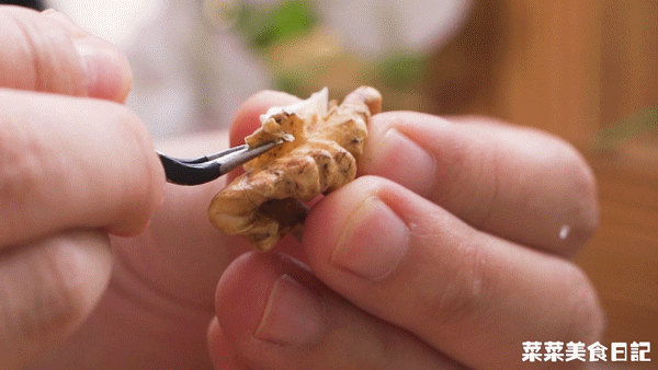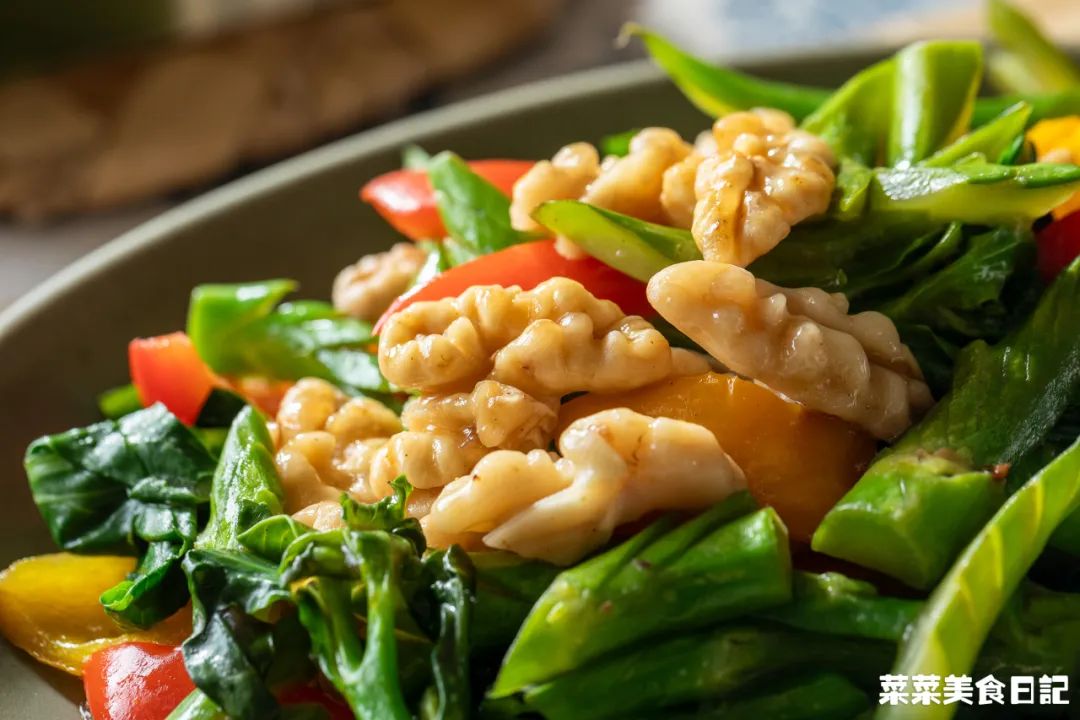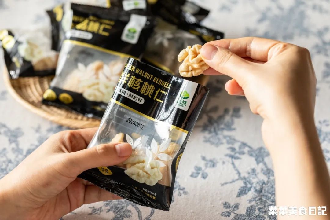 1小勺=1 tea spoon=5ml1.去皮核桃从冷冻室取出,过一遍饮用水解冻,沥干待用2.苦菊/芝麻菜去头切小段,青瓜拍一下,斜切成小段3.煮一锅沸水,加入1小勺盐、油,放入木耳煮至断生,捞起过冷水沥干待用4.小碗里加入1.5大勺蒜末、2个剁碎小米辣、1小勺辣椒面,泼入2大勺热油,再加入1大勺香油、2大勺香醋/佛手醋、2大勺生抽、1/2小勺盐、1小勺糖拌匀5.料理盆加入苦菊、青瓜、木耳、核桃,淋入酱汁拌匀食用鲜核桃80g 芥蓝200g 彩椒200g 蒜末1大勺 生抽1.5大勺 盐1小勺 松鲜鲜1小勺 淀粉1小勺 清水3大勺1.芥蓝梗对半片开,打花刀泡水待用,彩椒沿着彩椒芯切肉,再切菱形2.小碗加入1.5大勺生抽、1小勺盐、1小勺松鲜鲜、1小勺淀粉、3大勺清水拌匀3.热锅热油,煸香蒜末,依次加入芥蓝梗、彩椒、芥蓝叶中大火翻炒至断生再加入核桃,淋入酱汁,翻炒几下,酱汁挂住蔬菜即可出锅苦菊和青瓜爽脆,核桃仁酥脆,木耳脆糯,牙齿忙得不行,却乐在其中。再吃小炒,核桃和芥蓝都挂上一层芡汁,看着就食指大动。芥蓝泛着清苦,被核桃的清甜中和,虽是炒菜,清爽程度不输凉拌菜。鲜核桃吃一个鲜字,再往后,新核桃变成干核桃,就失了这份独特的水灵。但鲜核桃水分多,怕运输过程中发霉变坏,特意找来了开袋即食的鲜核桃仁,氮气锁鲜,顺丰冷链包邮到家。自己剥核桃容易碎、皮还会残留(如图右),别人剥的干净完整,吃着好过瘾~放心,这款鲜核桃仁纯纯物理脱皮,无任何化学药剂,配料表仅有核桃!8斤鲜核桃才出一斤核桃仁,做了每袋20g的包装,里头含2颗鲜核桃。大家收到后记得放冰箱冷冻,可保存12个月,口感也会更好。
