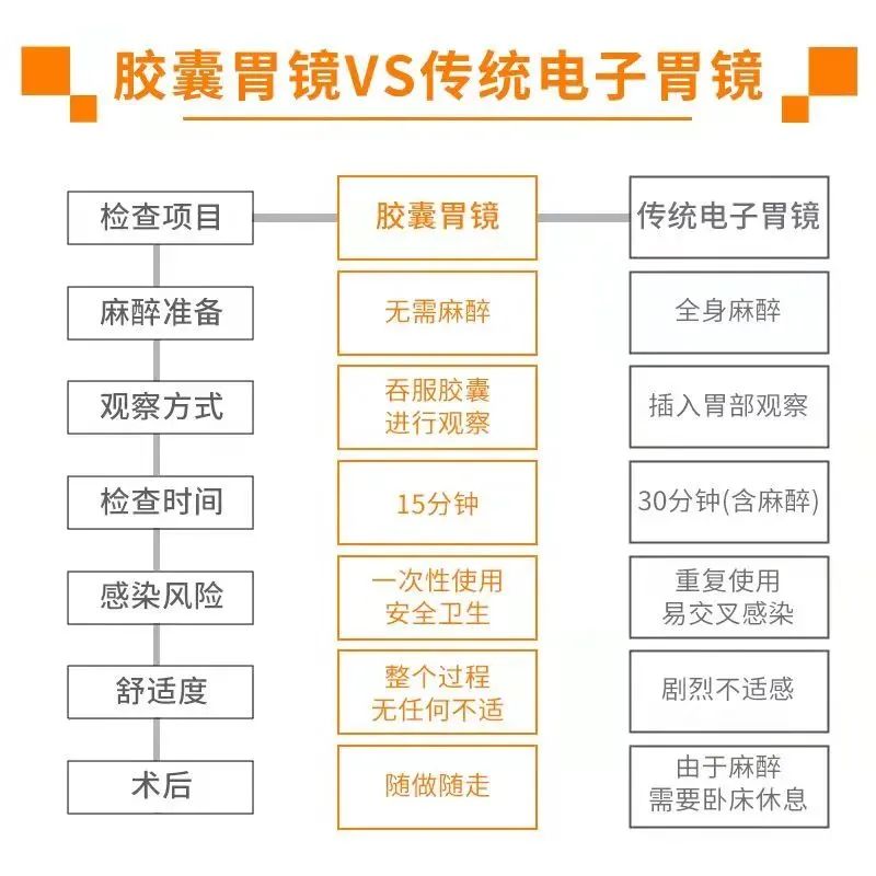 与电子胃镜相比,磁控胶囊内镜真正实现了无痛、无伤、无交叉感染的舒服洁净的胃和小肠检查。