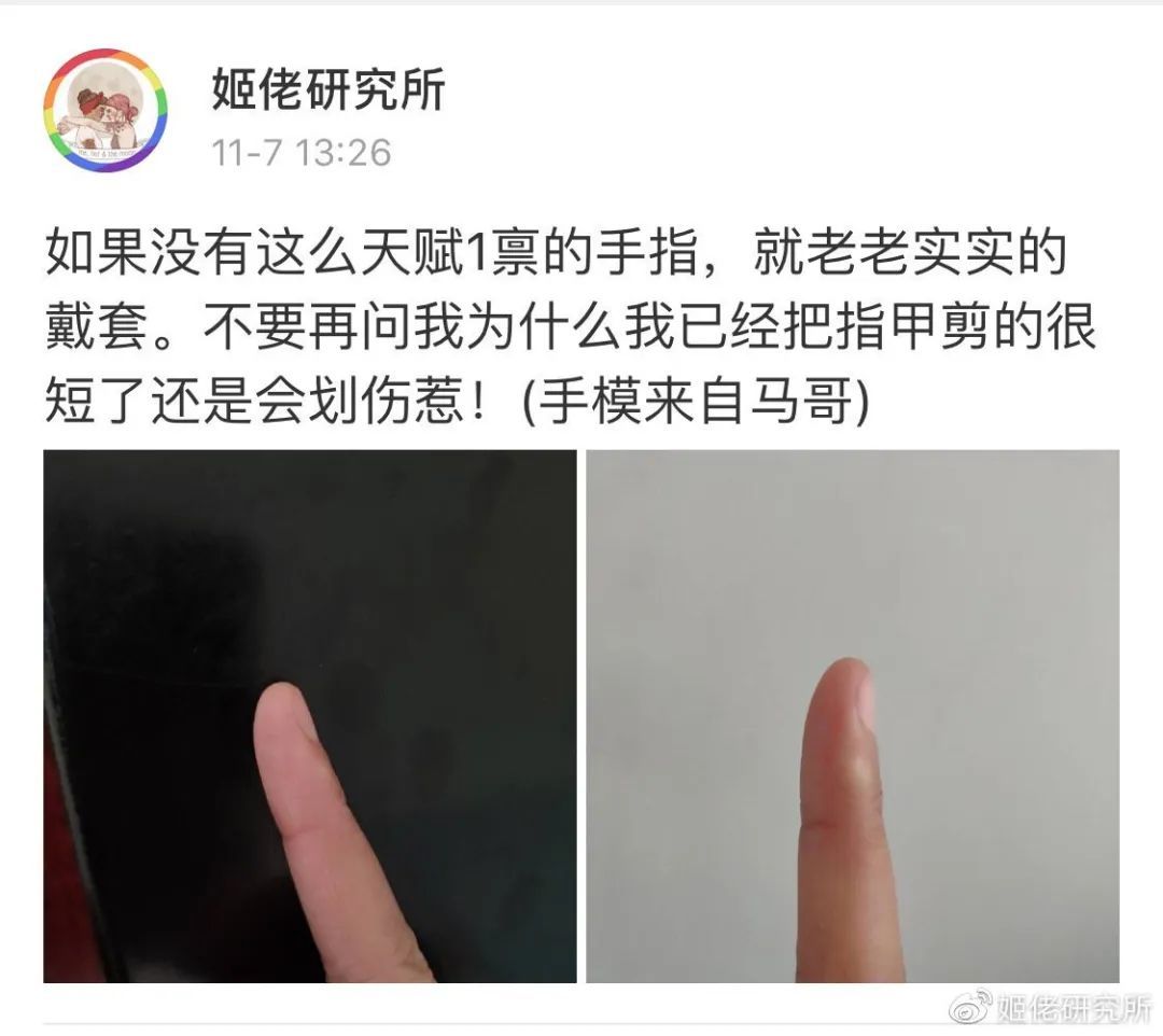 很多人以为剪了指甲就不会受伤了,并不是,就算剪得再秃再光滑,可能还是会划伤,毕竟是一个硬的尖锐物,一旦有过出血情况的,务必要坚持戴套。