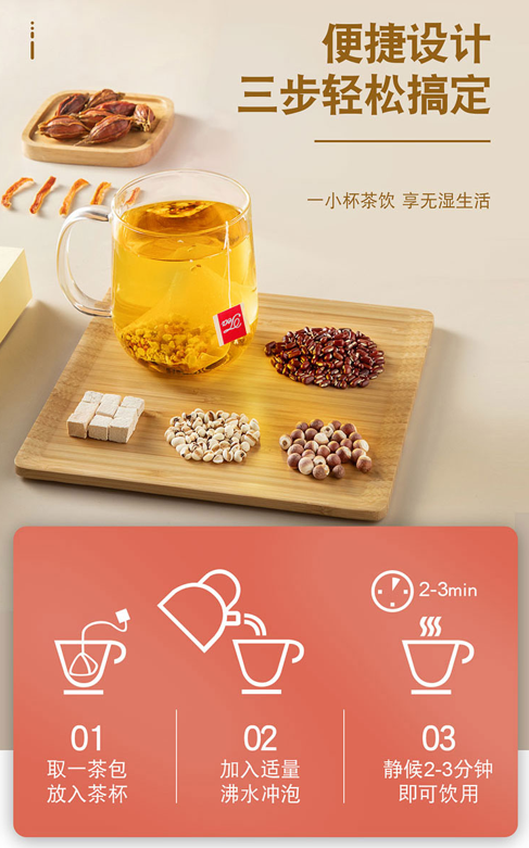 一盒足有20小袋,每一小袋都采用独立密封包装,防潮防尘,随喝随开,干净卫生,也方便携带,不管去哪里,随身带上一包,随时都能喝上一杯祛湿好茶。