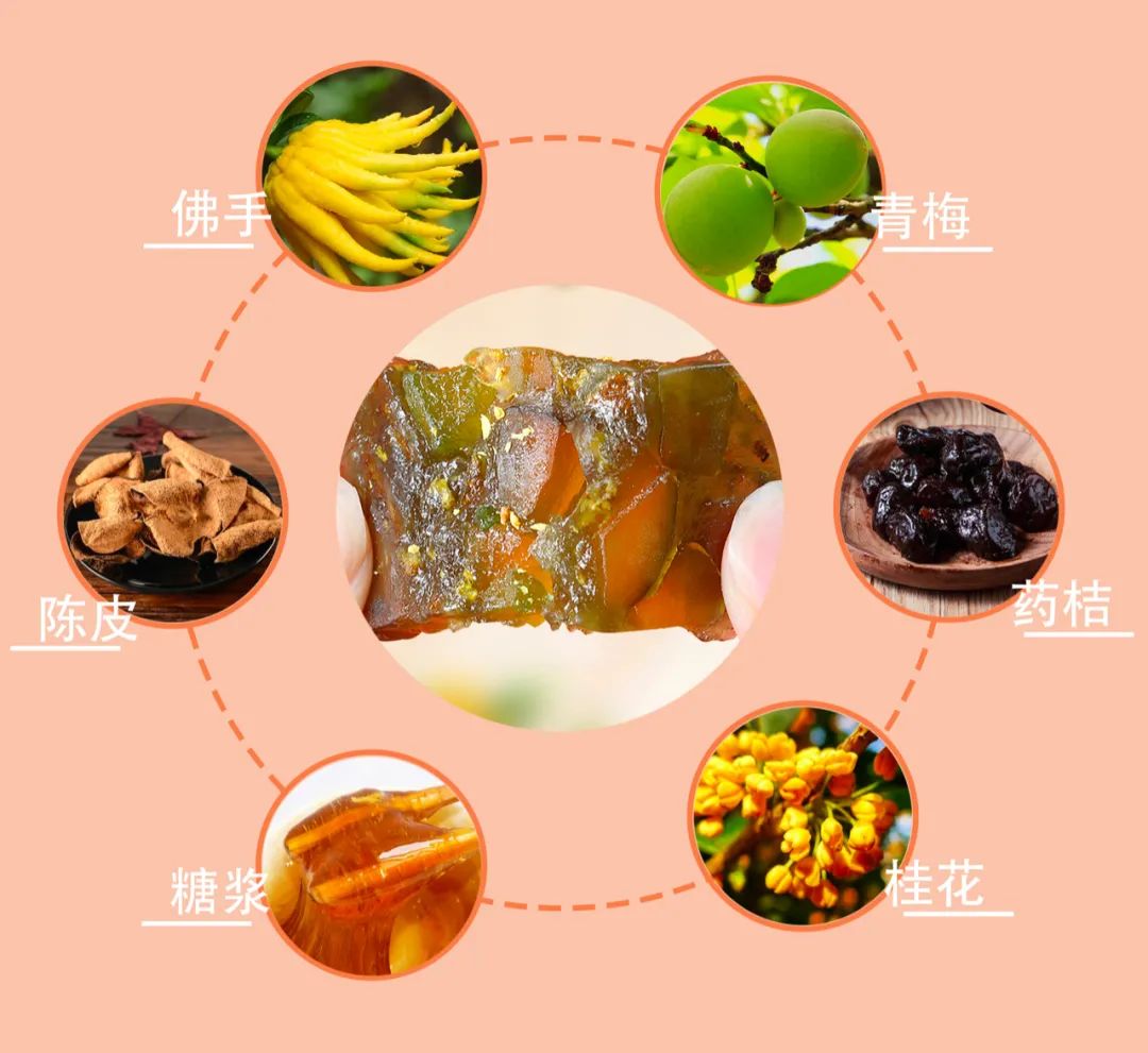 食藥成分有:佛手、陈皮、药桔、青梅、桂花等,都经精挑细选,采用优质且营养价值高的原材,确保疗效!