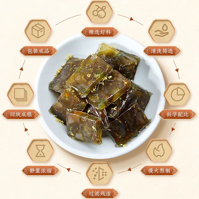 经过熬制将融合了多种食材的九制陈皮佛手糕做到好吃美味,保证药食材的原汁原味!不添加香精、防腐剂~
