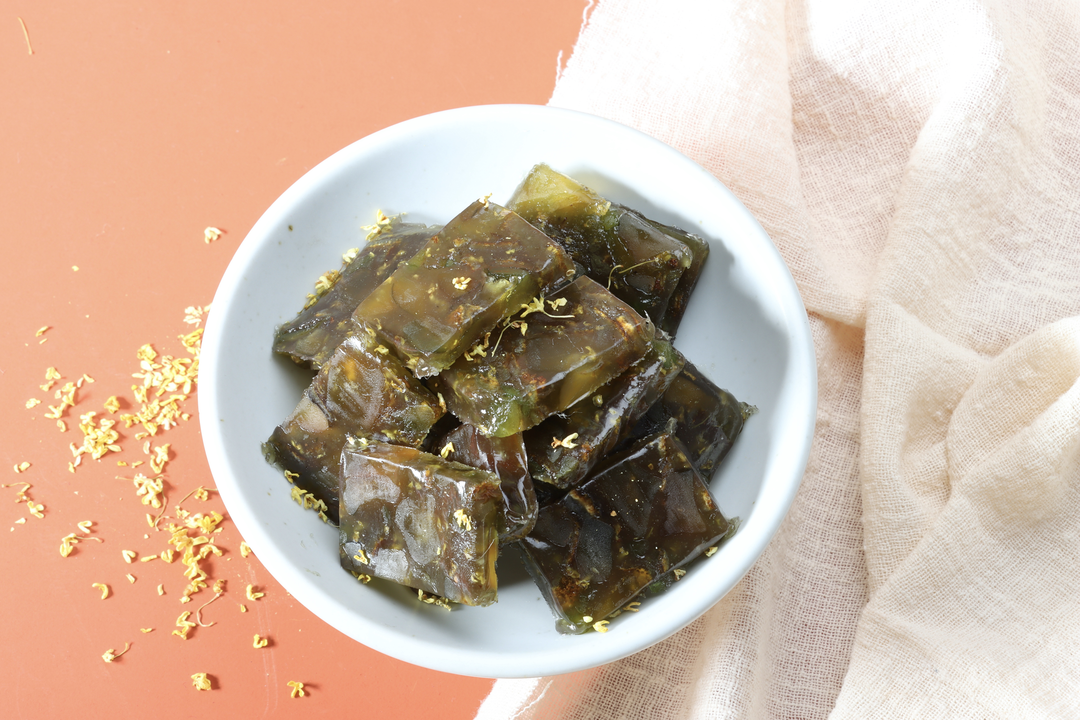 糕体每一片都晶莹剔透、清澈明亮,里面佛手、青梅、陈皮、药桔每一味食藥材都清晰可见!