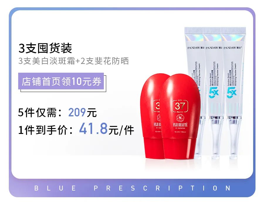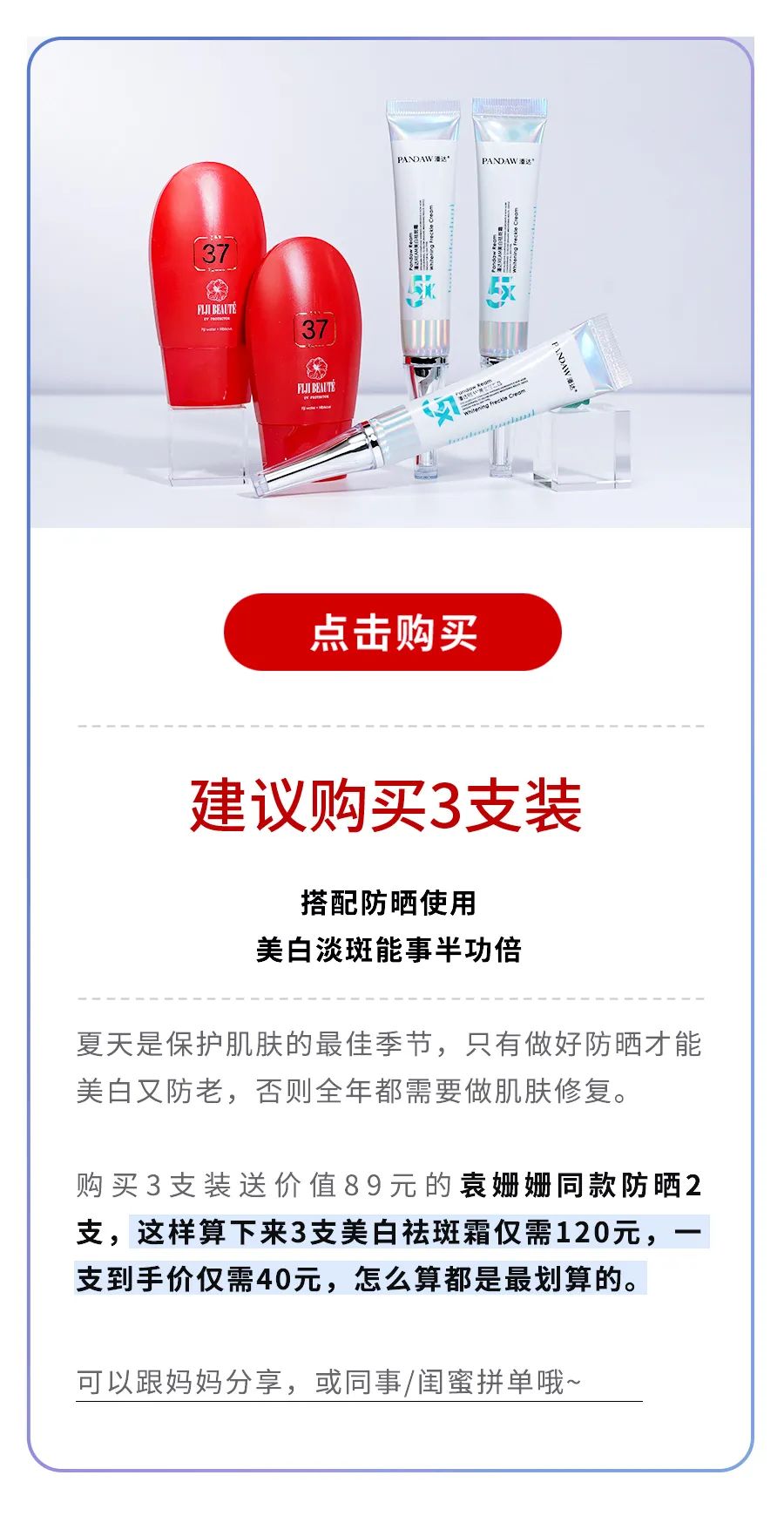 现在买3支祛斑霜免费送2支袁姗姗同款斐花纯物理防晒乳。