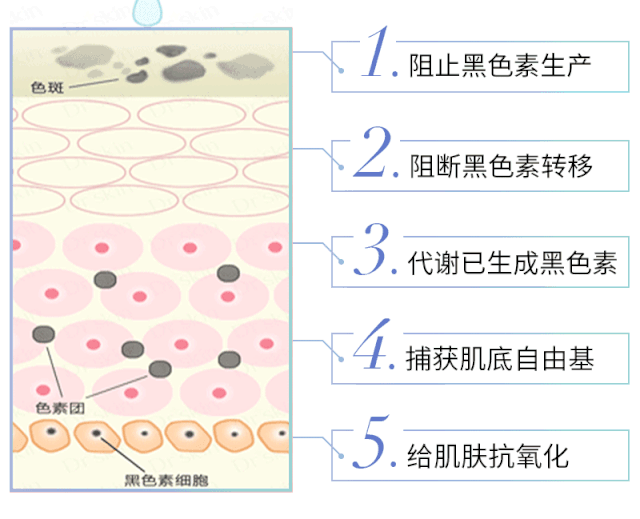 能够从5个维度,全面粉碎黑色素的分泌、转移、代谢,并起到很好的抗氧化、清除自由基作用。
