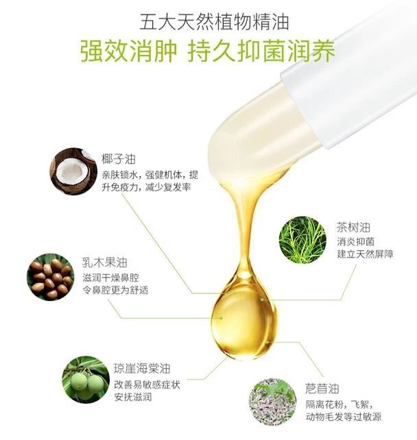 除了四大核心成分,还有椰子油、茶树油、乳木果油、琼崖海棠油、苨苜油五种天然植物精油,涂抹后保持鼻腔的滋润与舒适。