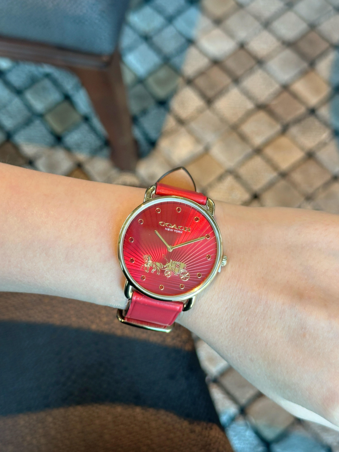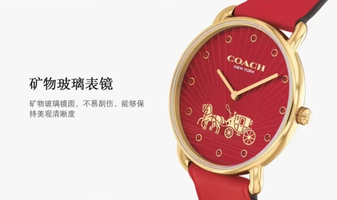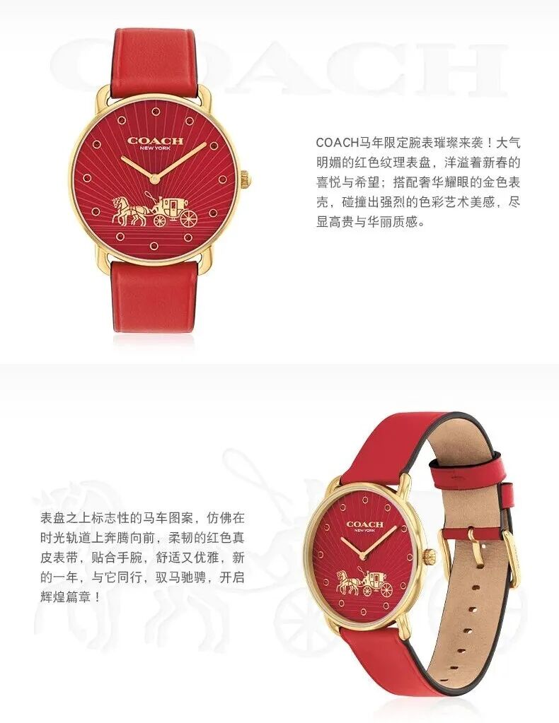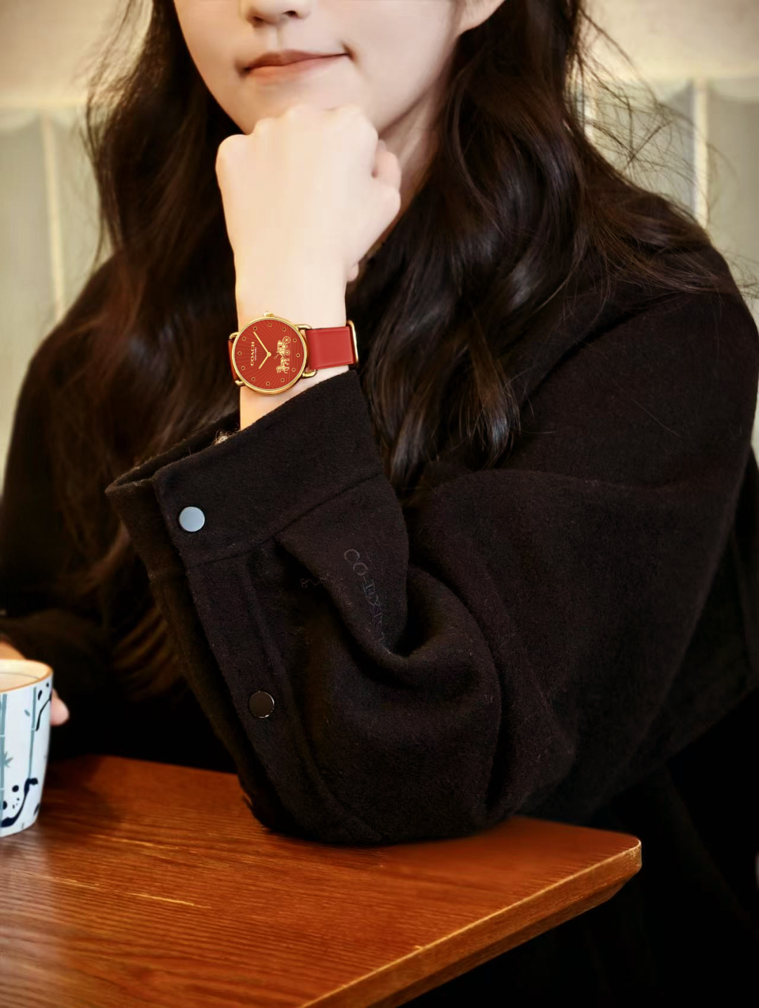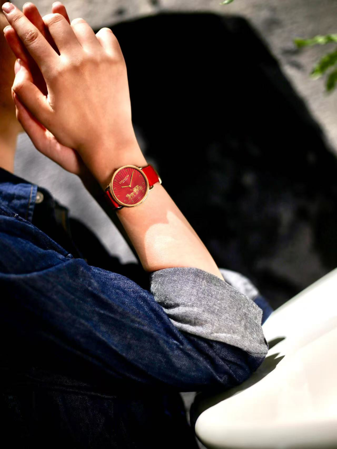 金色圆形表壳,搭配象征富贵与喜悦的红色真皮表带与红色纹理表盘。