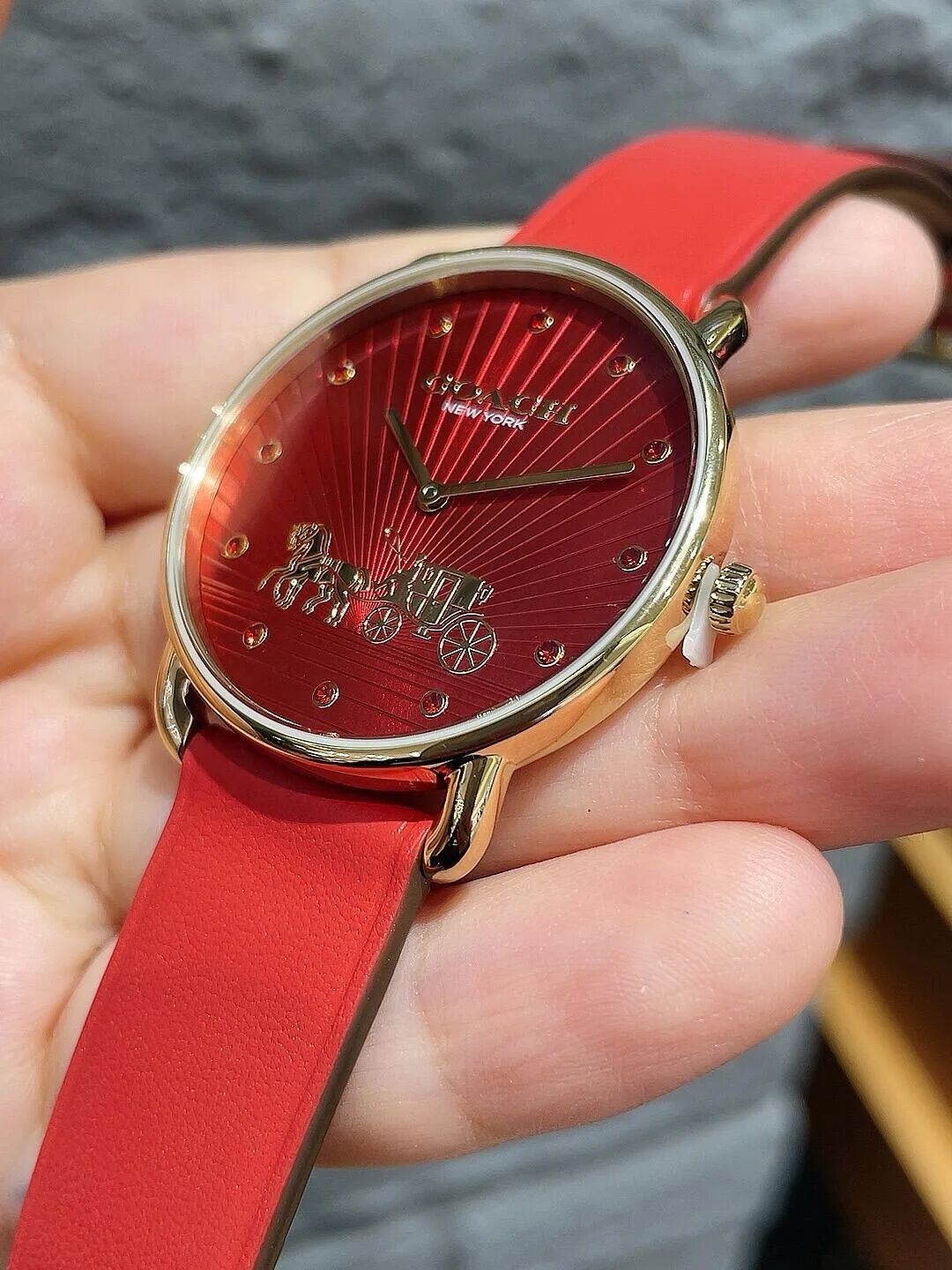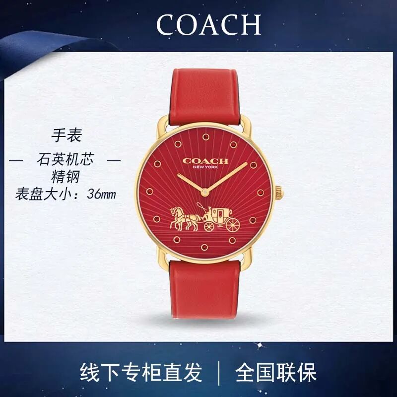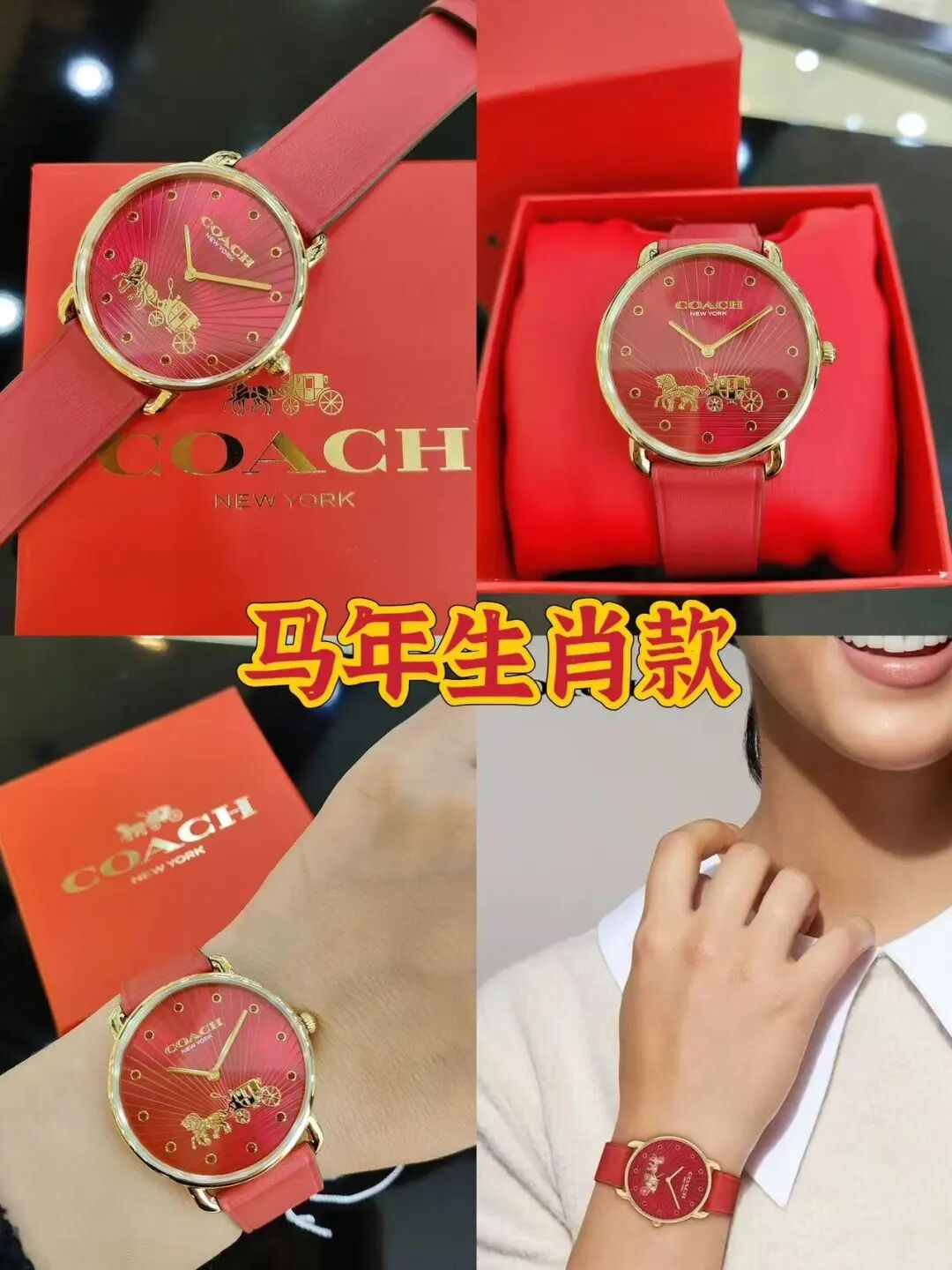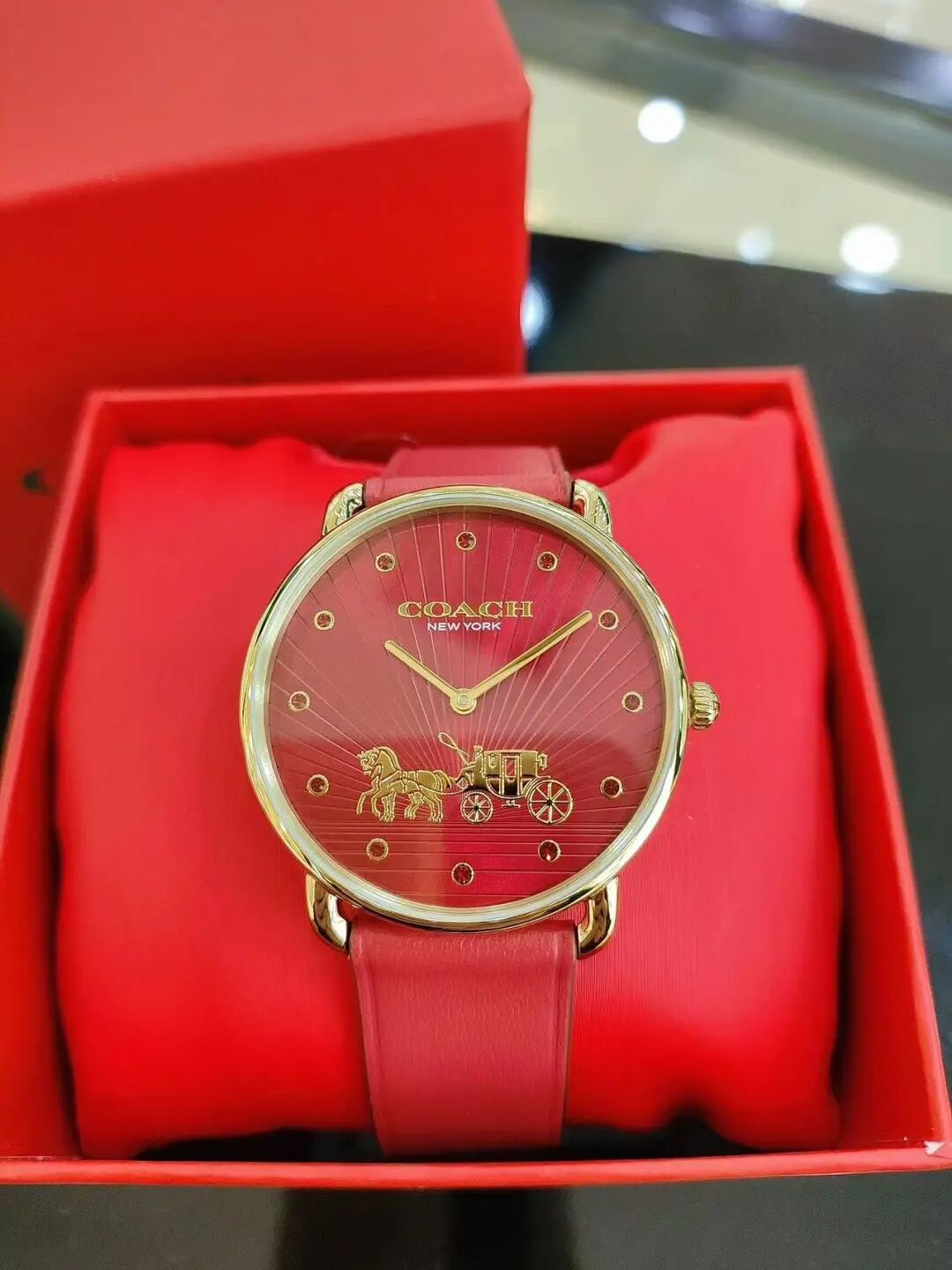 金色圆形表壳,搭配象征富贵与喜悦的红色真皮表带与红色纹理表盘。