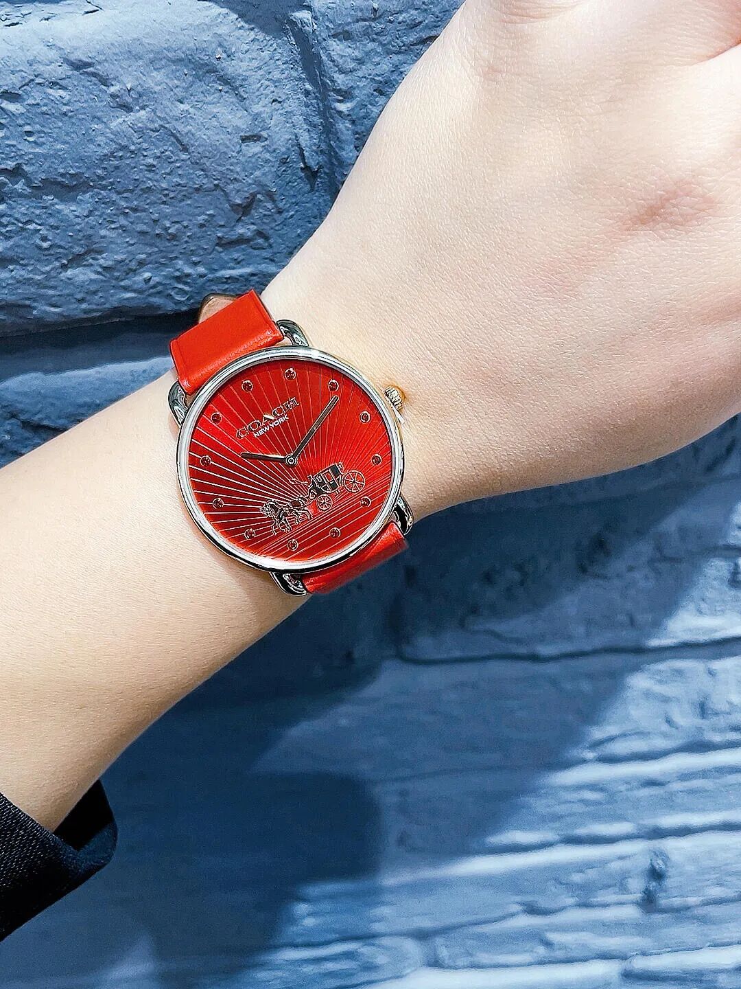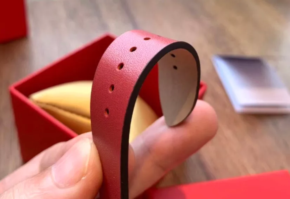 红色真皮表带,柔软细腻,配以可调节针扣设计,贴合手腕曲线,上手舒适自然,搭载石英机芯,走时精准。