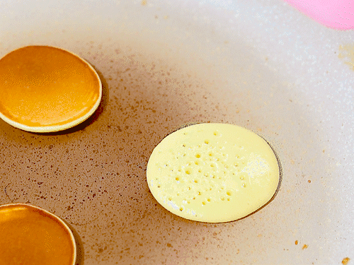 3.瓶盖上扎个小孔,面糊挤在平底锅中,小火烙至金黄,翻面烙另外一面