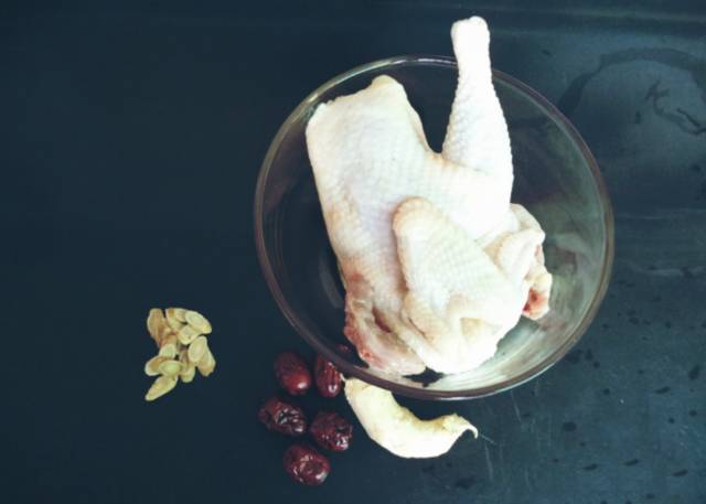 1、准备个容器,装入鸡肉,鲜姜2片,泡好的黄芪15克,泡黄芪的水也一并倒入,放入枸杞和大枣,再用手蘸点盐放进去;