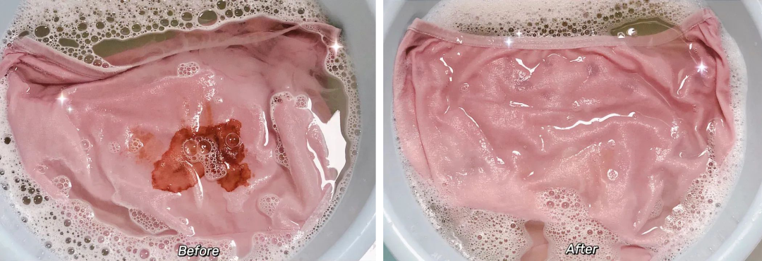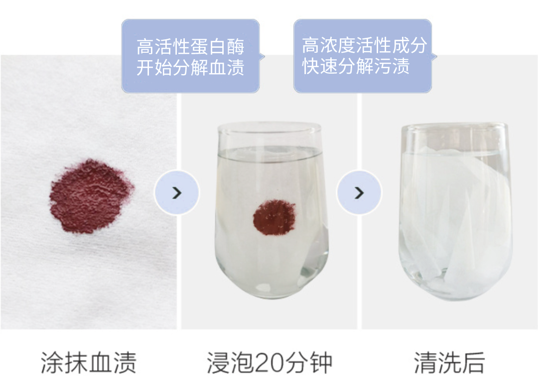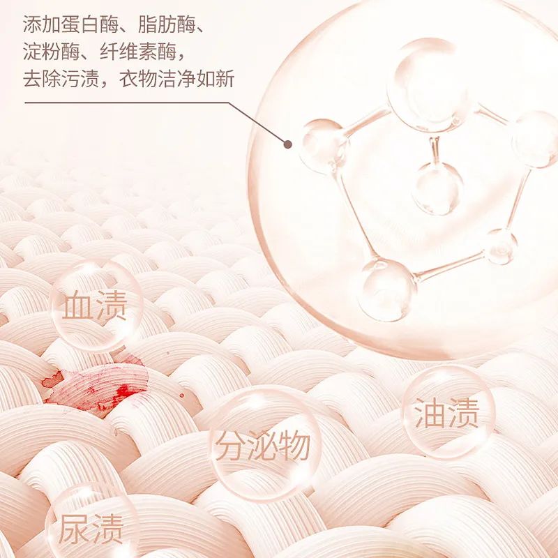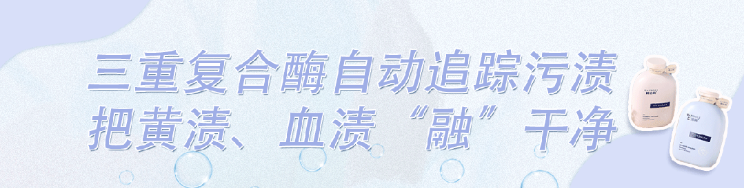 平常内裤上的分泌物、经期血渍等大部分都是蛋白质,而活性酶能够精准、有效地分解掉私密血渍、尿渍、黄渍等。