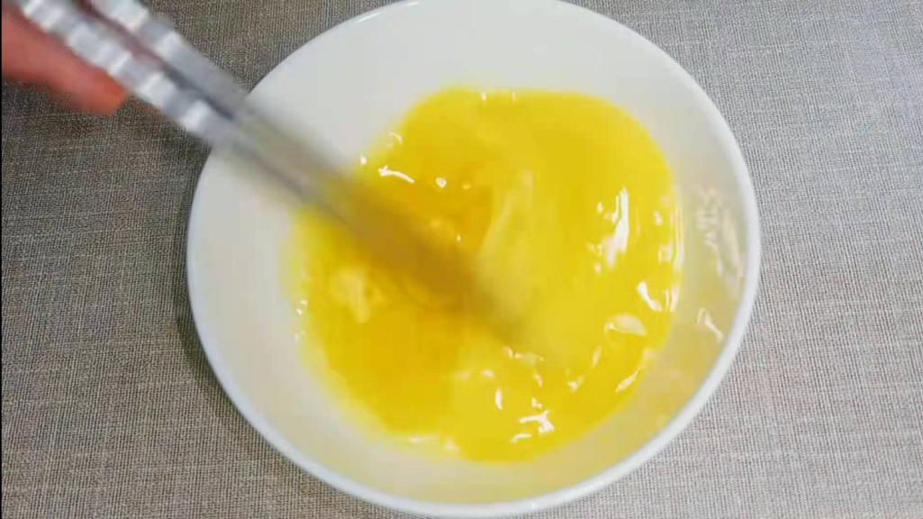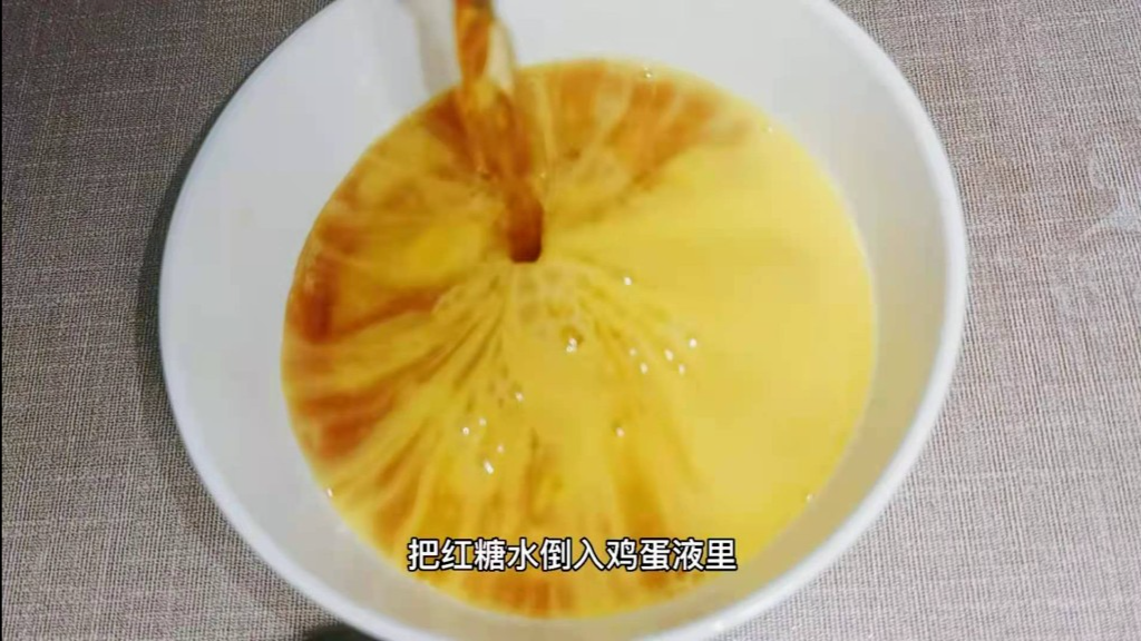 2、两个鸡蛋打入碗中充分搅匀。另外再拿一个小碗,放一勺红糖,也是充分搅拌,再把搅拌过的红糖水倒入鸡蛋液之中。