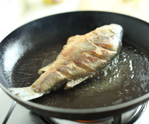 2、将鱼入锅时注意,手提鱼尾,鱼头入锅动作要慢;
